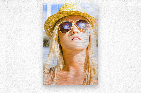 Face Of Fashion With A Beautiful Beach Babe Or Woman Wearing Straw Hat And Hot Sunglasses Staring At The Sun At A Warm Temperate And Humid Beach Locat...[+]