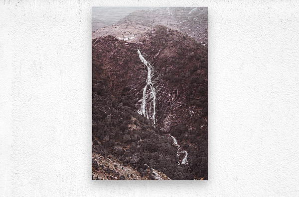 Antique style photo art on a vintage waterfall flowing down a rocky mountain face in wild west tones. Horsetail Falls Queenstown Western Tasmania Australia