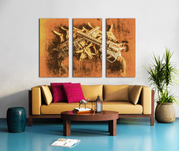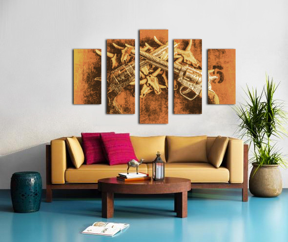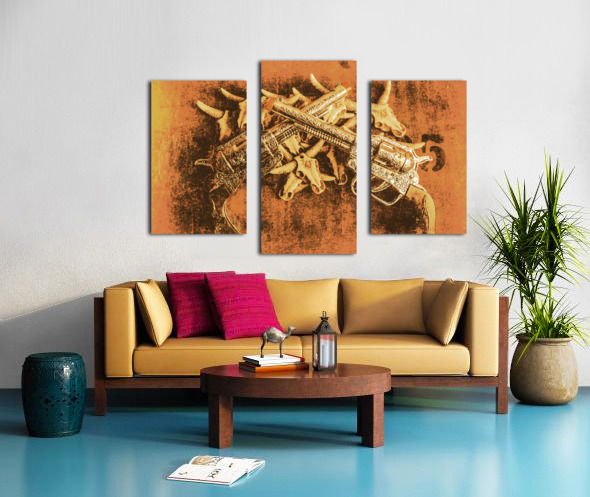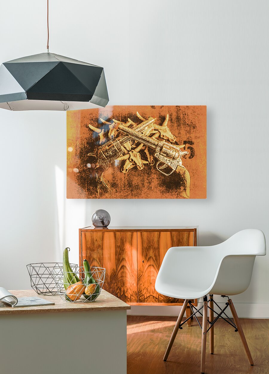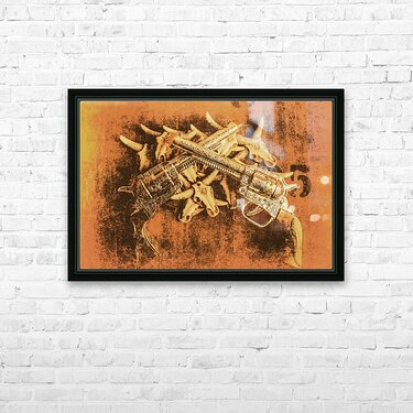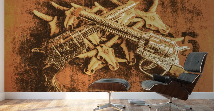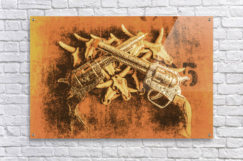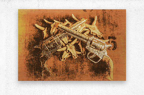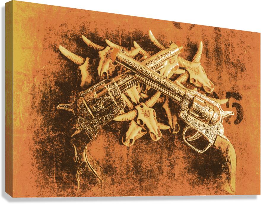 Rustic rural still life art on a saloon scene of cap guns and cattle skulls. Old West Cowboy Shooter