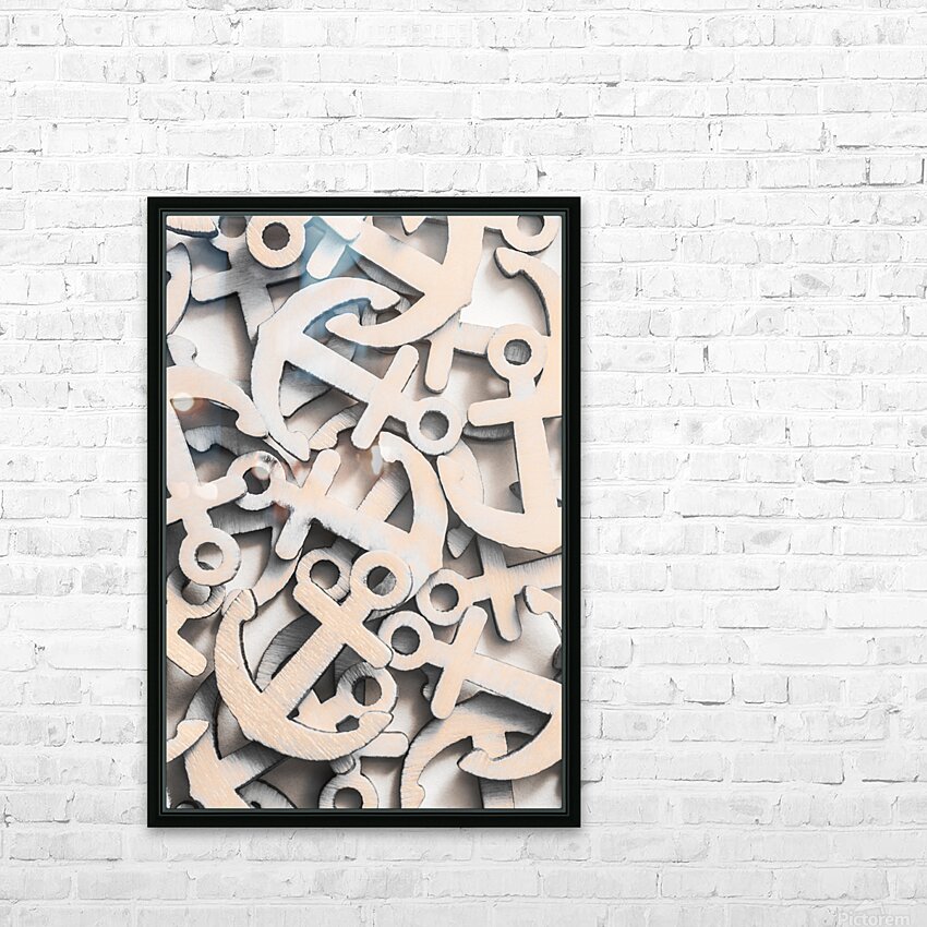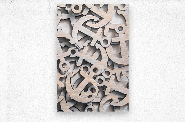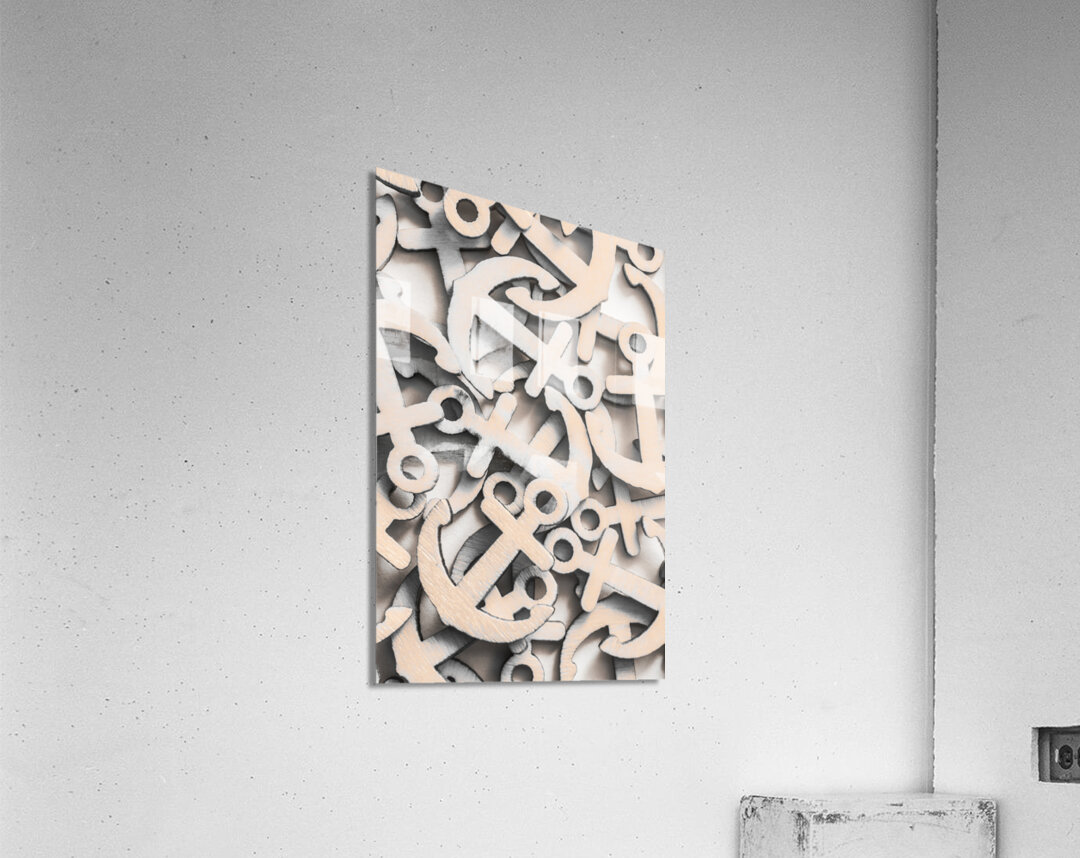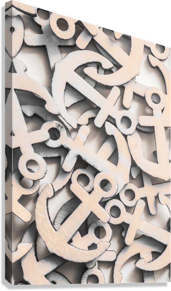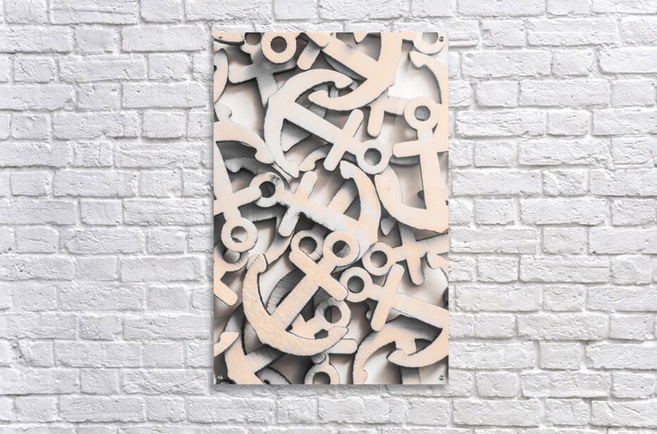 Still life backdrop on a weighting of wooden anchor icons from moored fixture. Setting Seas