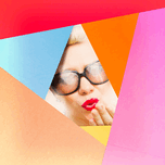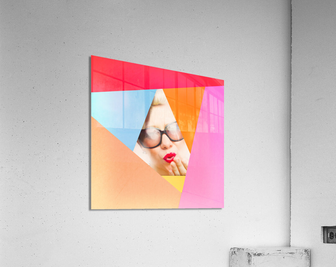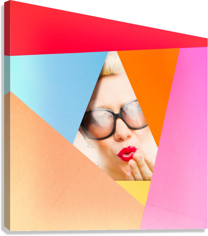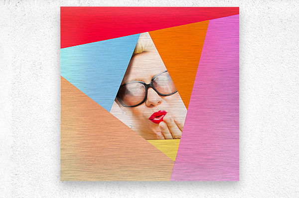 Creative retro fashion girl with surprise expression in revival sunglasses in front of makeup color schemes board. Cardboard pin up