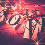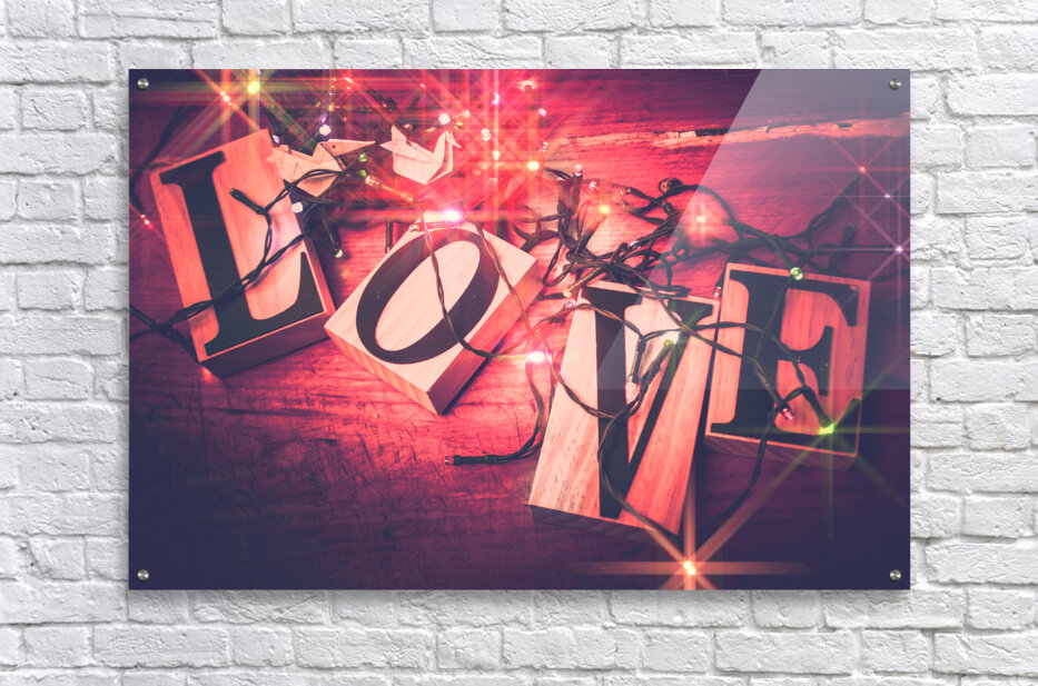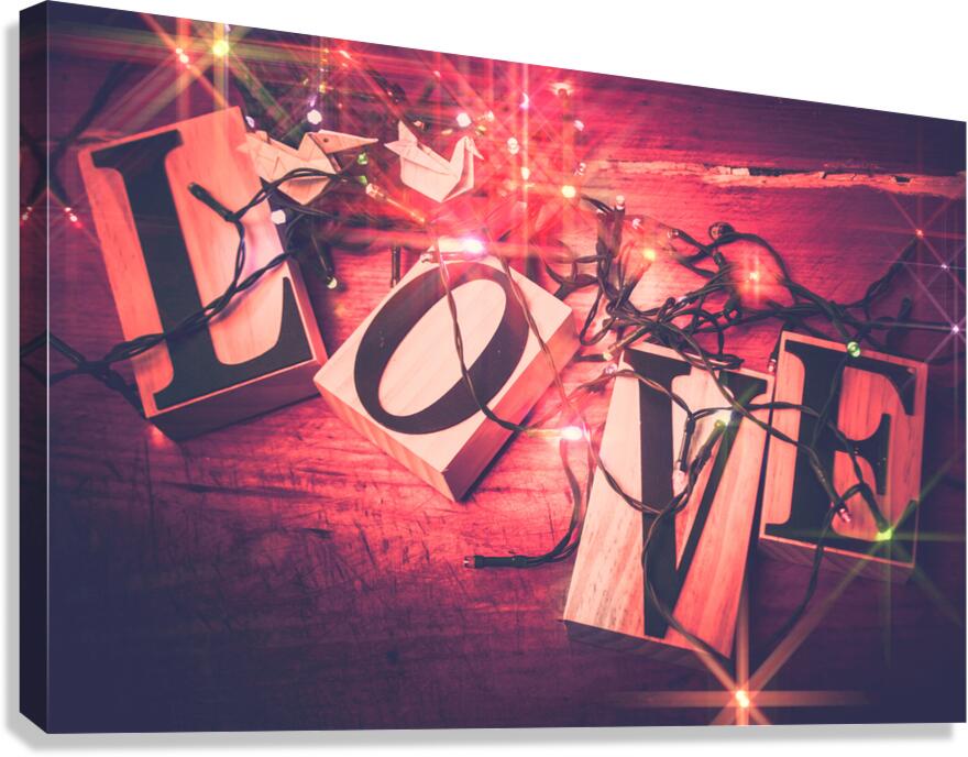 Horizontal still life scene on wood décor blocks lights and paper cranes. Love birds and wooden sentiments