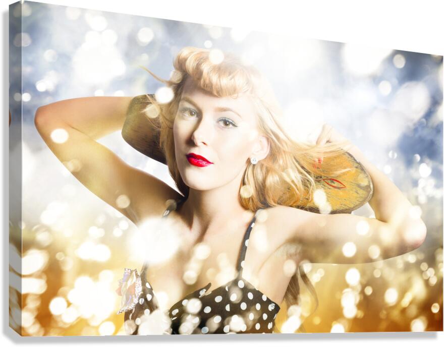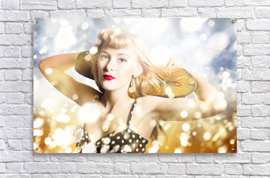 Bright intense creative photograph of a beautiful young blonde woman holding skateboard on shoulders in a scatter of blurred bokeh lights. Creative skateboarding pin up