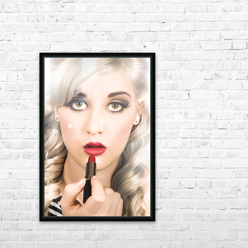 Sexy retro pinup girl applying makeup on lips Picture Frame Printing