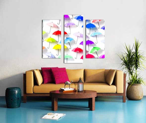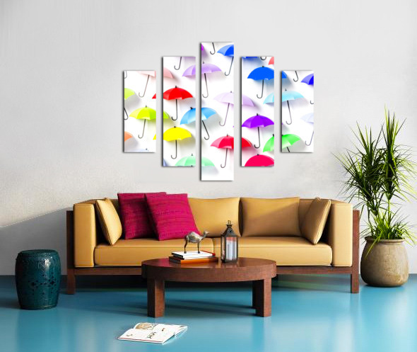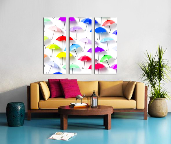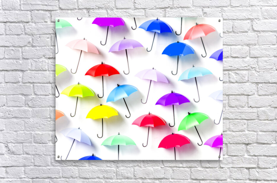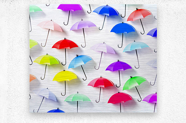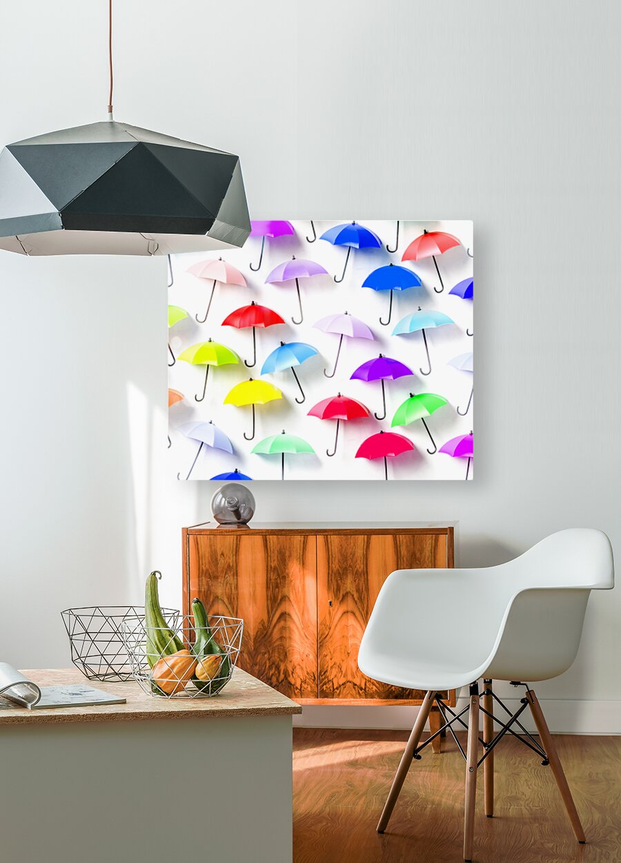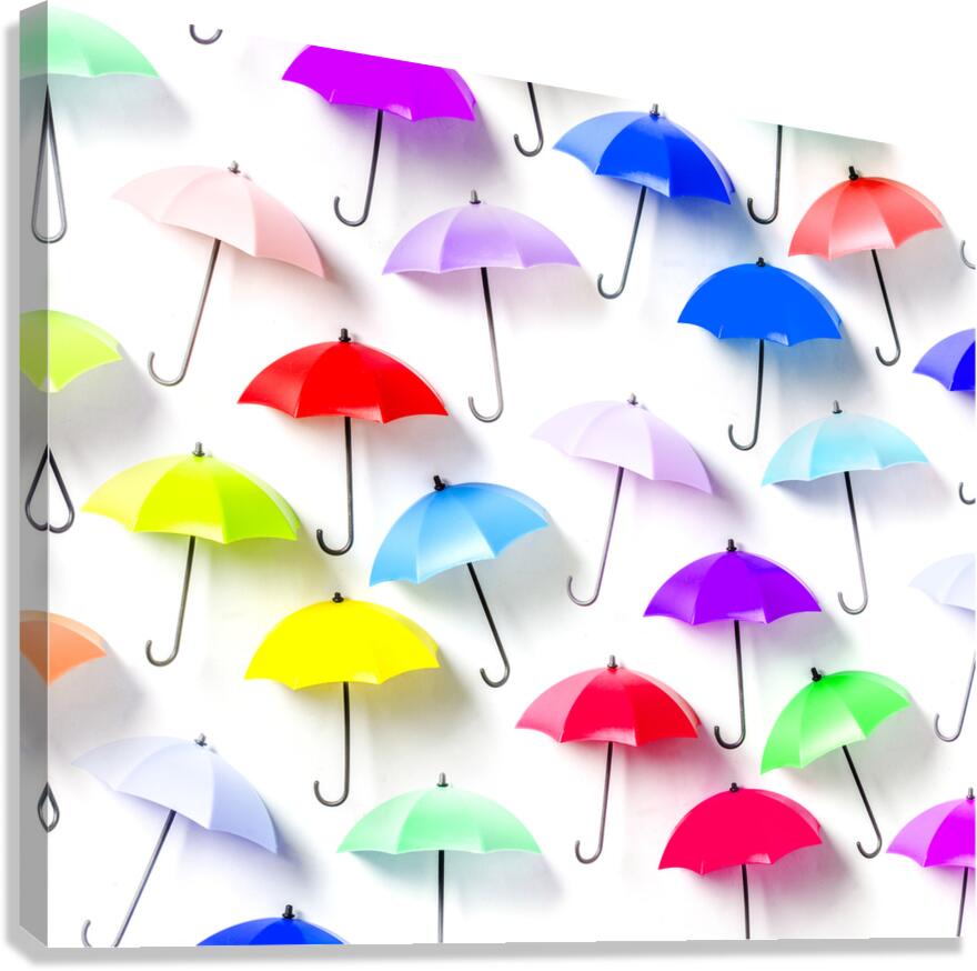 Whimsical still life art on decor umbrellas abstracted in rainbow patterning. The rain collection