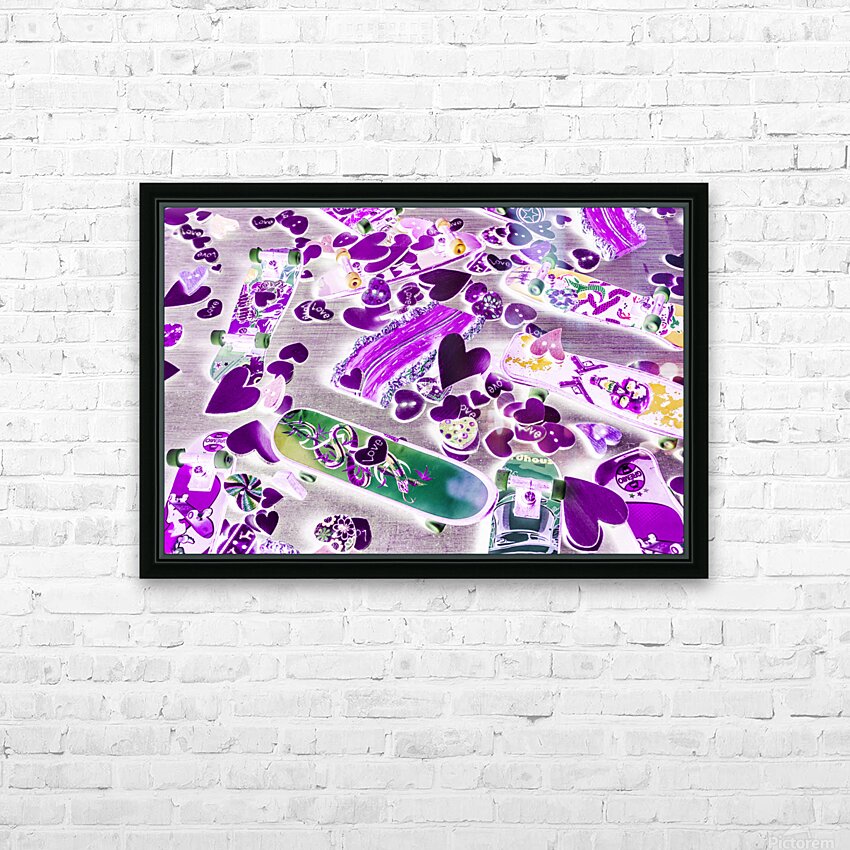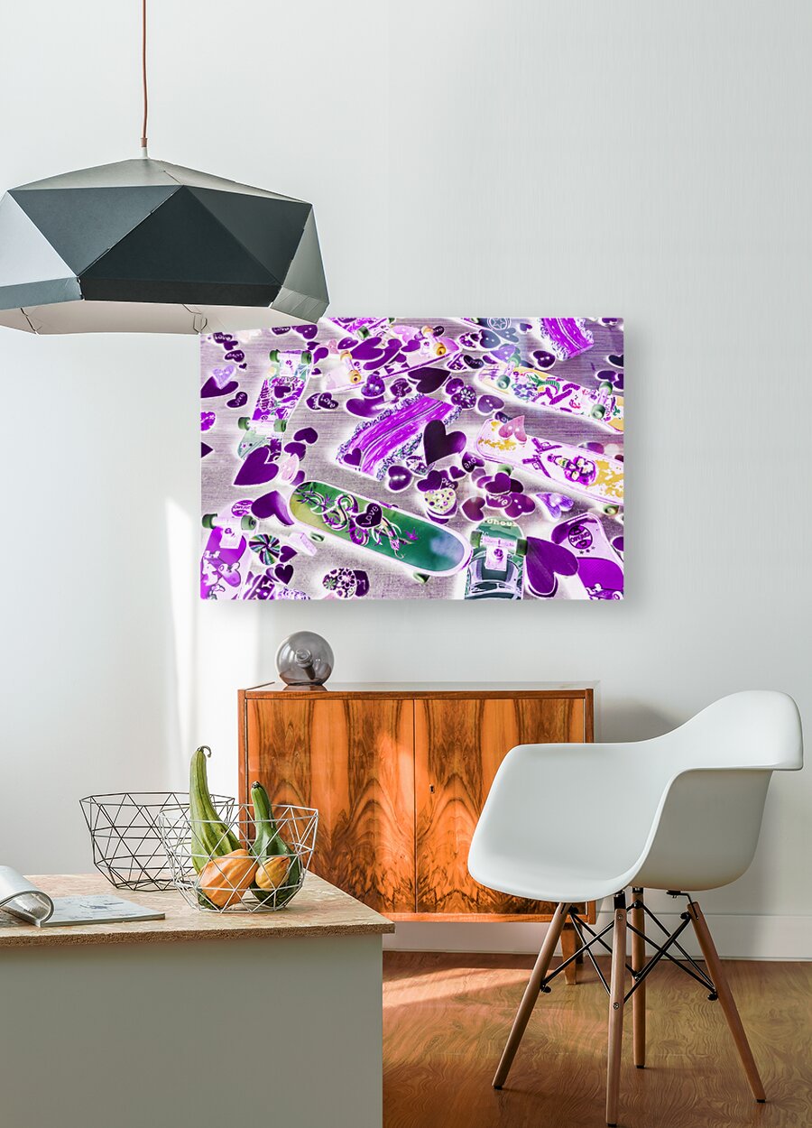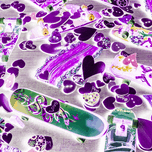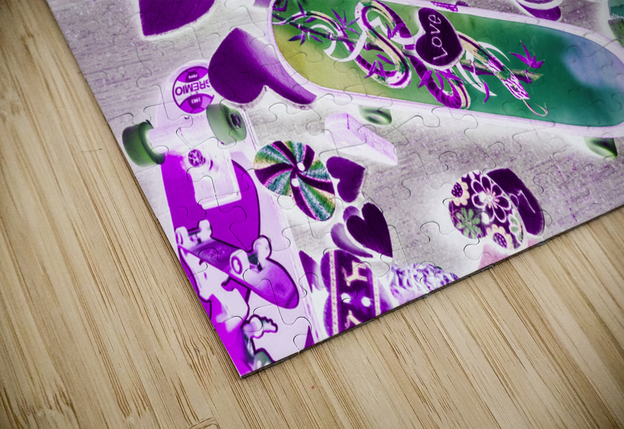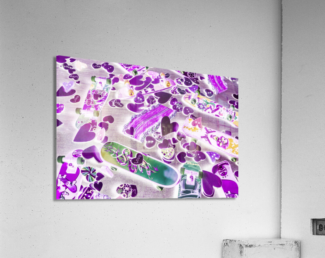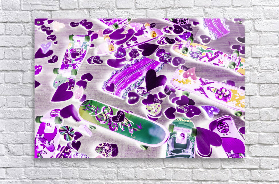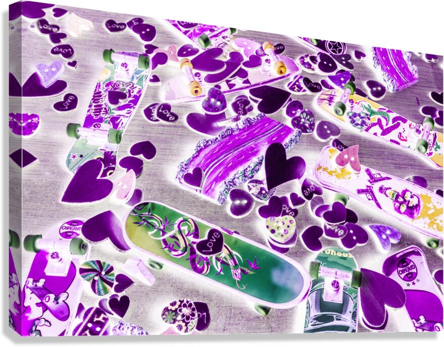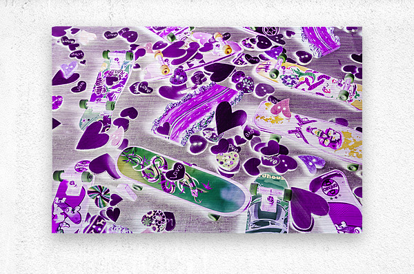 Creative toned purple artwork on a placement of romantic symbols of skateboarding love. Skate date
