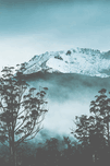 DRAMATIC DARK BLUE MOUNTAIN WITH SNOW AND FOG