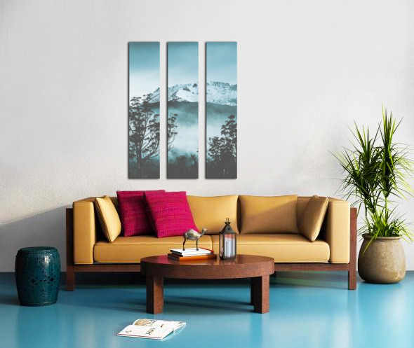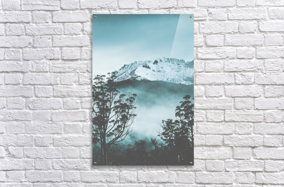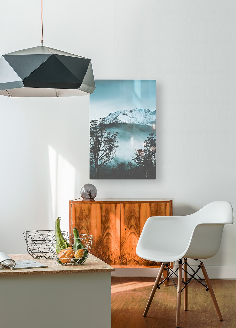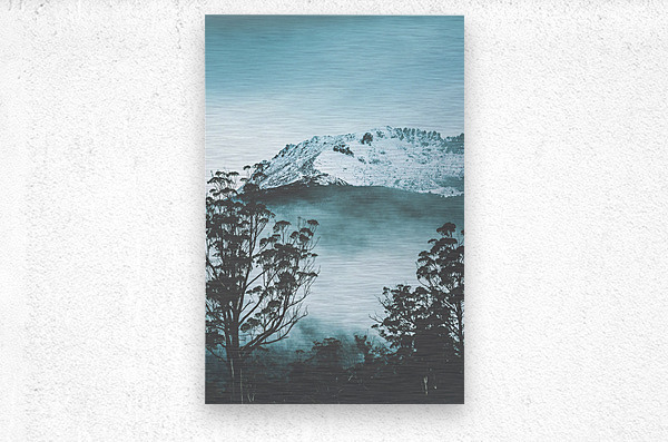 ABOUT THIS ARTWORK: DRAMATIC DARK BLUE MOUNTAIN WITH SNOW AND FOG
