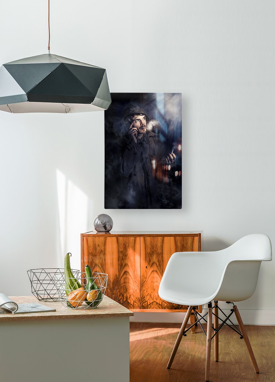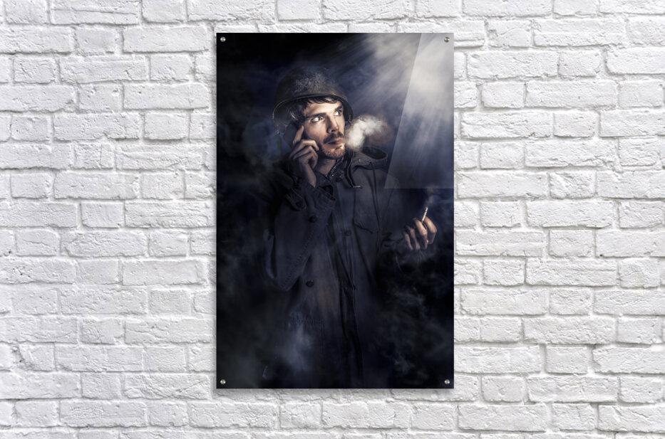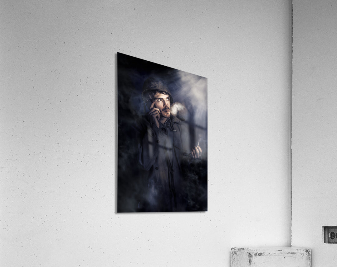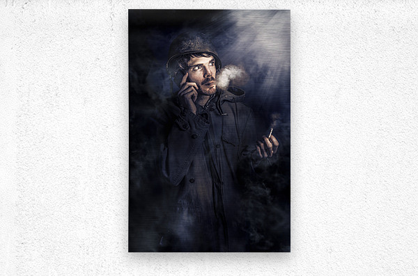 Fine art photo of an anxious Australian SAS soldier on night watch smoking cigarette in a plume of mist and fog while phoning for a command update. Call of duty
