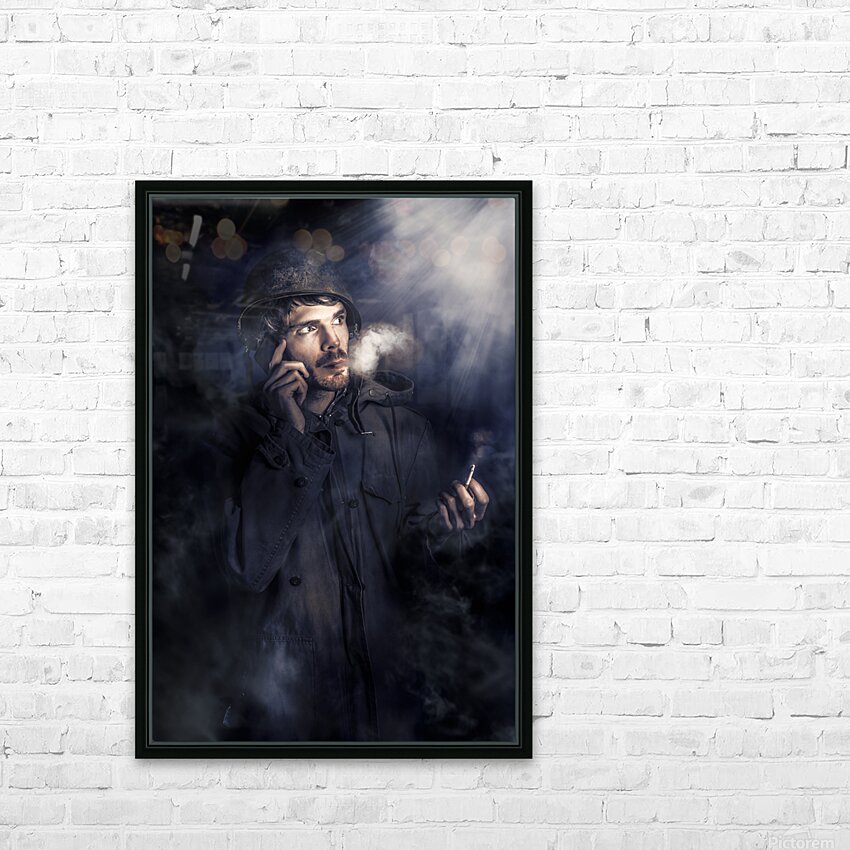 Fine art photo of an anxious Australian SAS soldier on night watch smoking cigarette in a plume of mist and fog while phoning for a command update. Ca...[+]