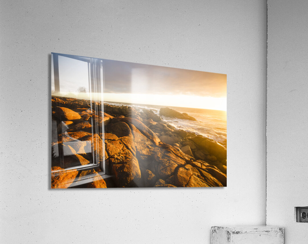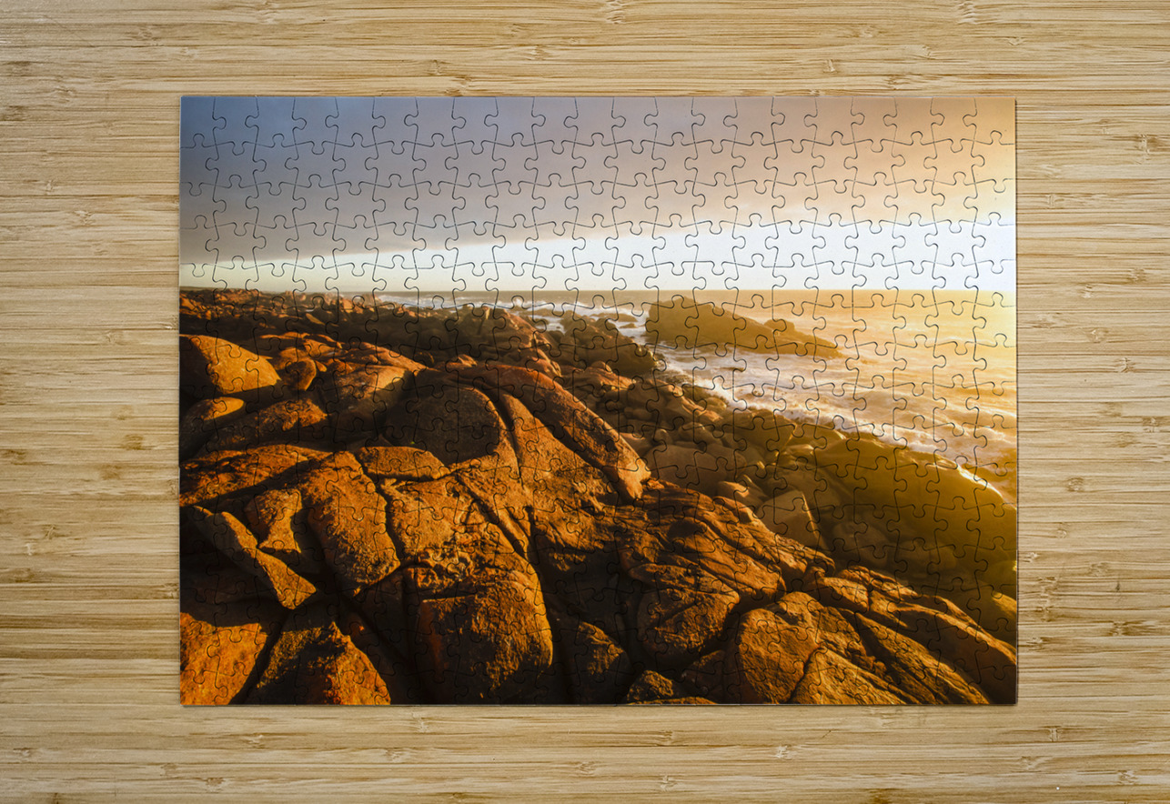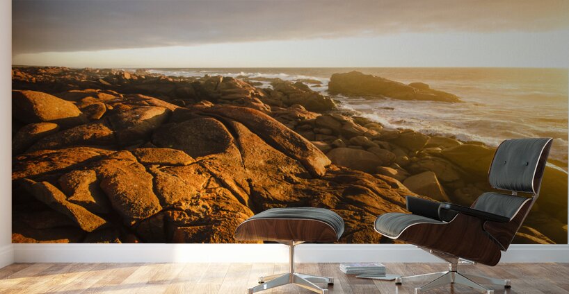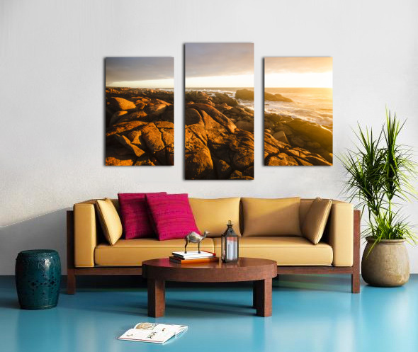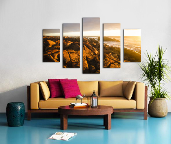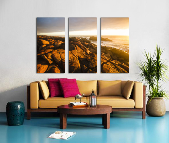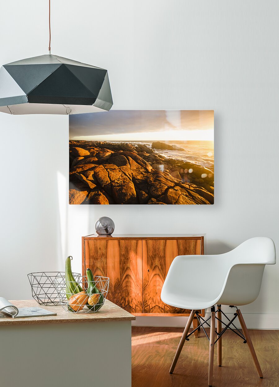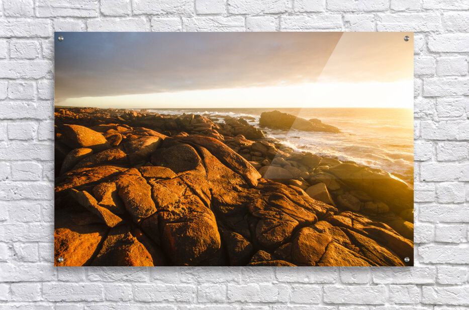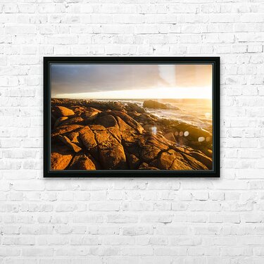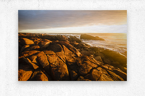 Golden fine art landscape on a rocky beach at sunset in Granville Harbour Tasmania Australia