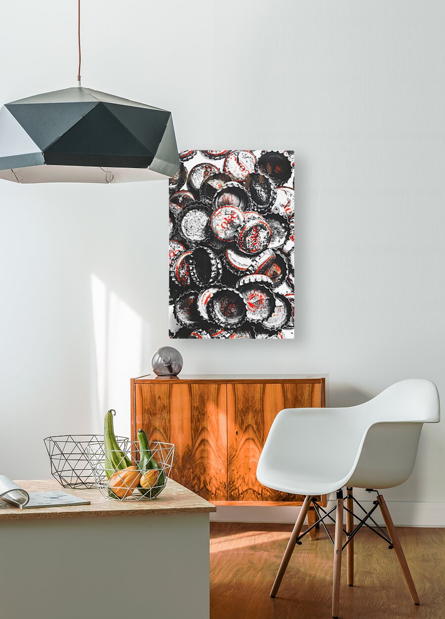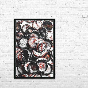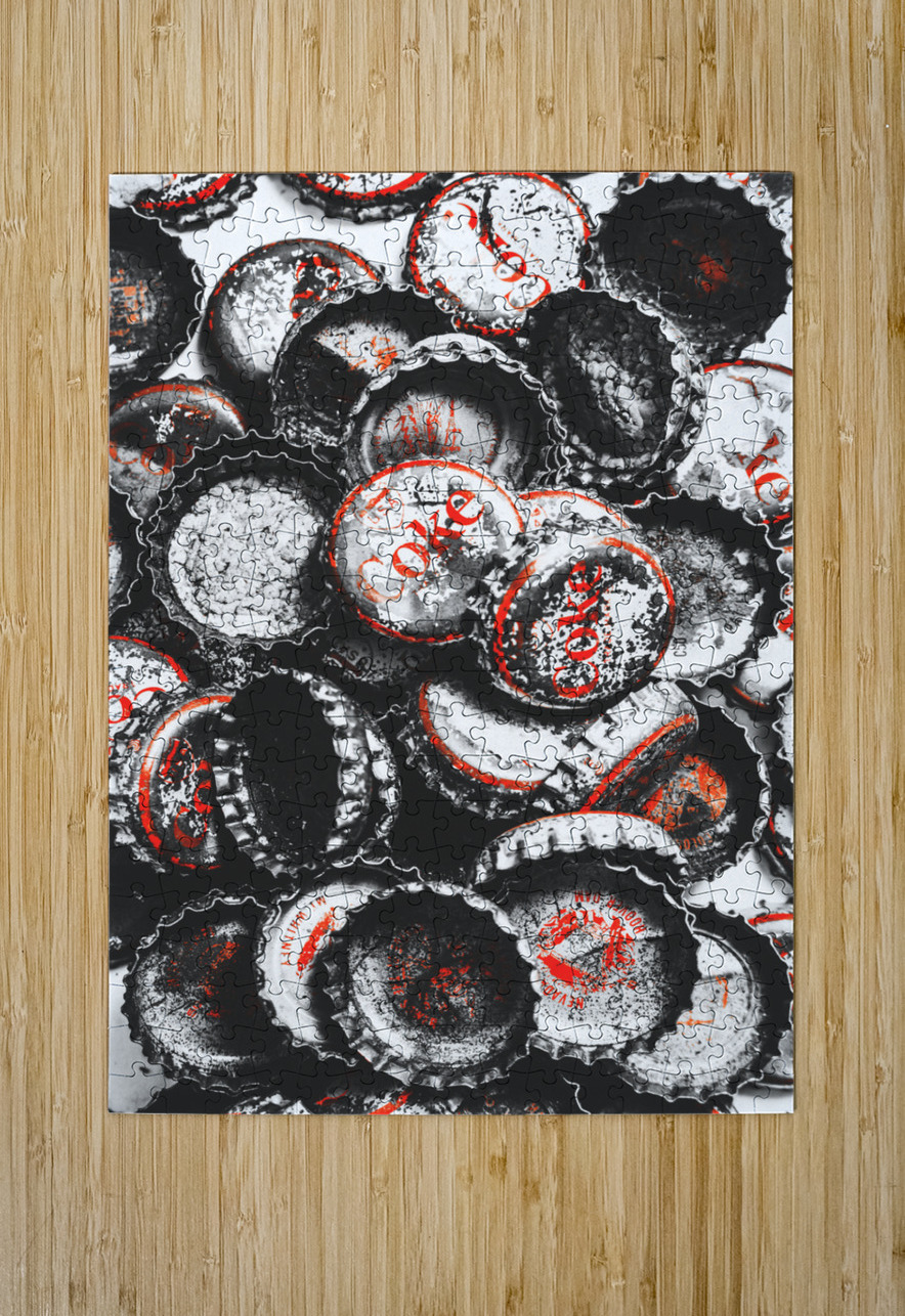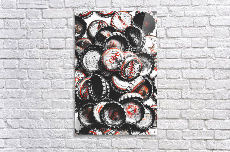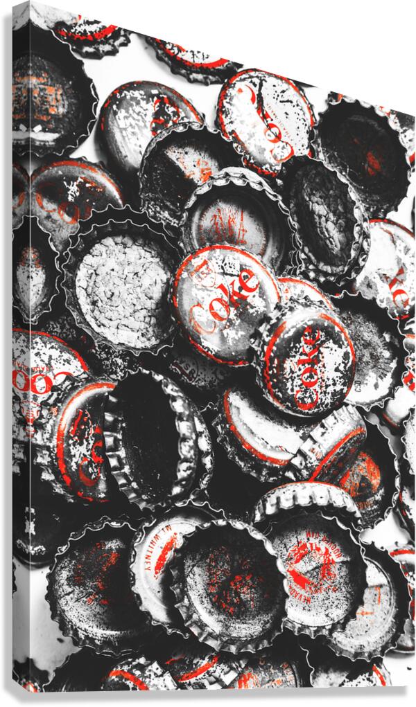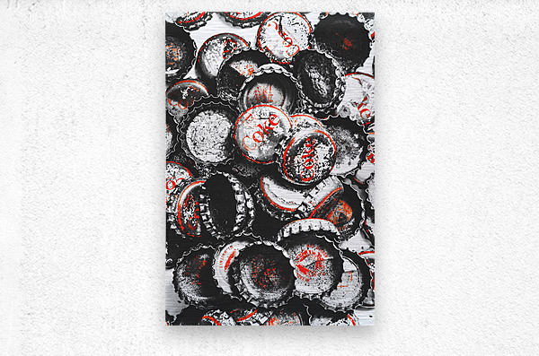 Roadhouse antiquities in a pile of iconic soda pop lids in rusty grey red and white. Top off nostalgia