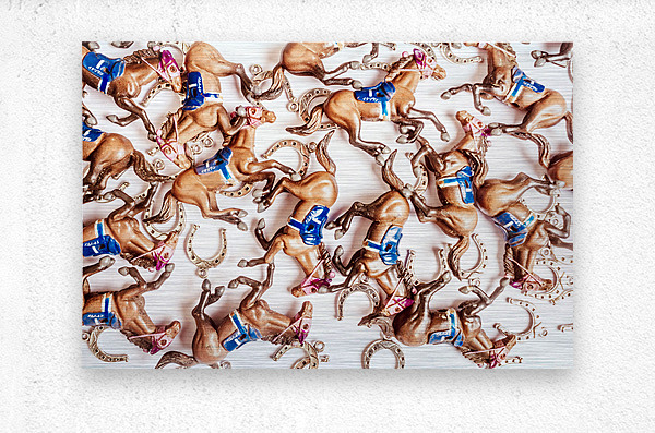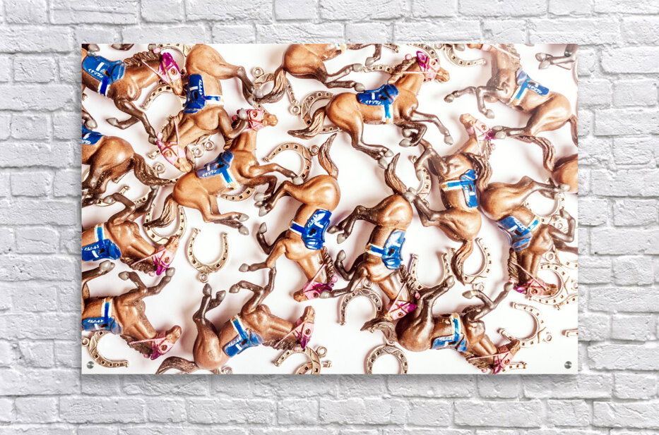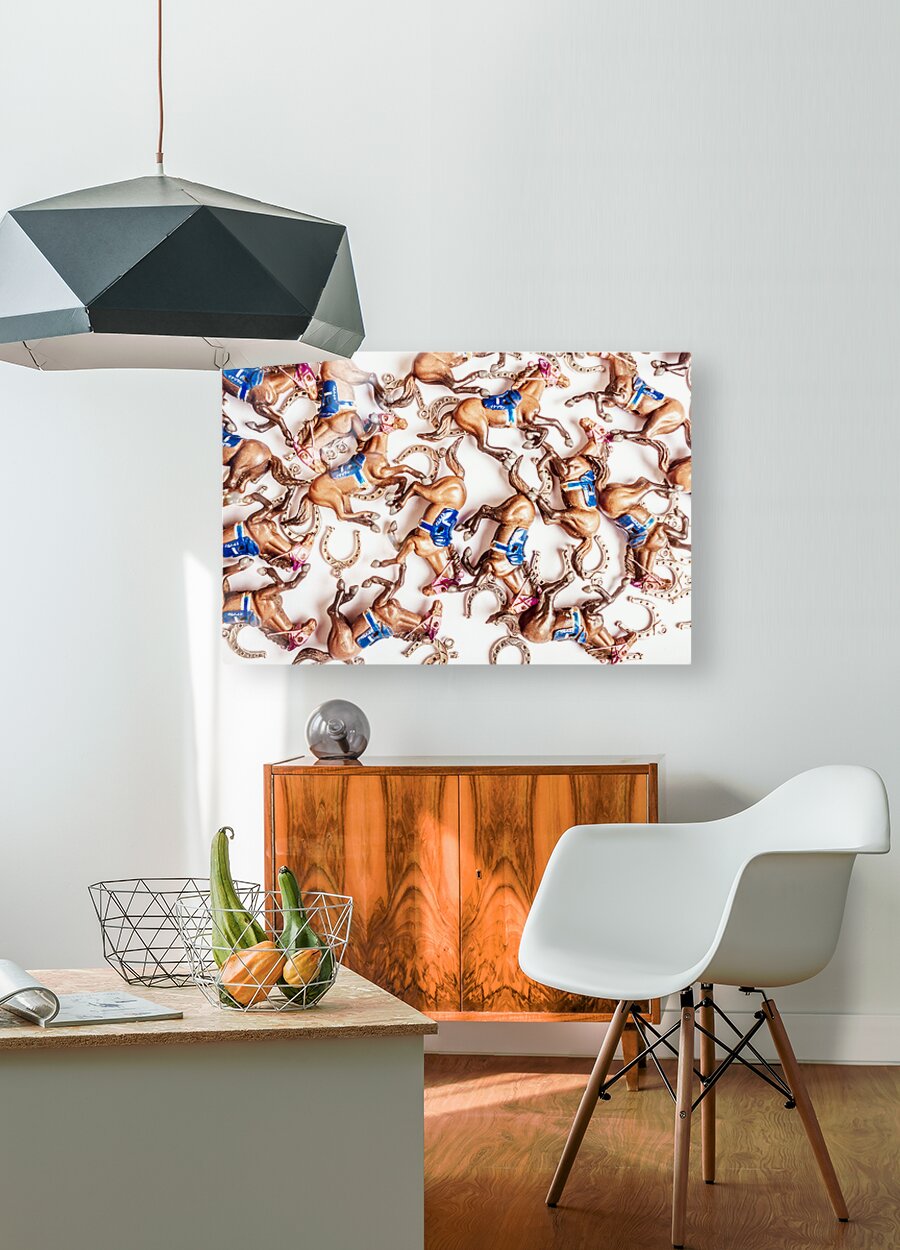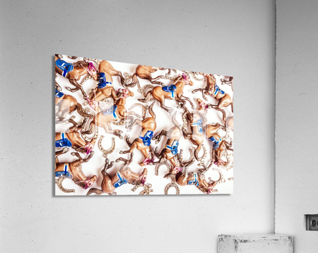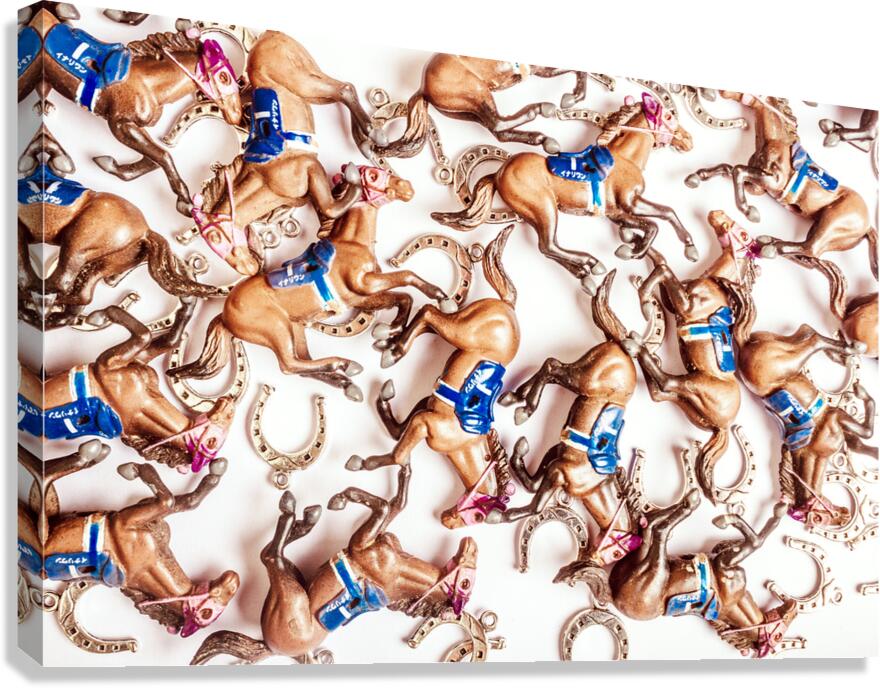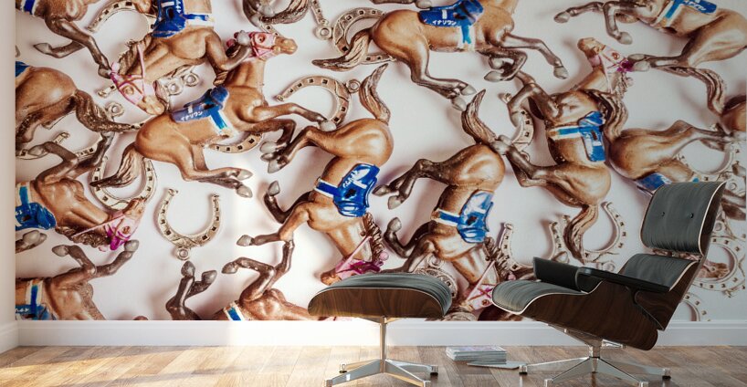 Bright creative race horse design on decorative horses galloping in an abstract carnival. Horseshoe cup