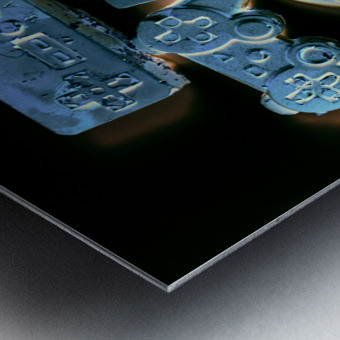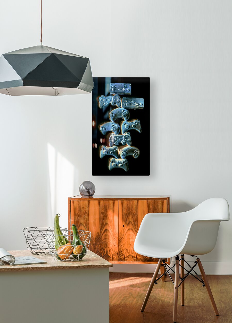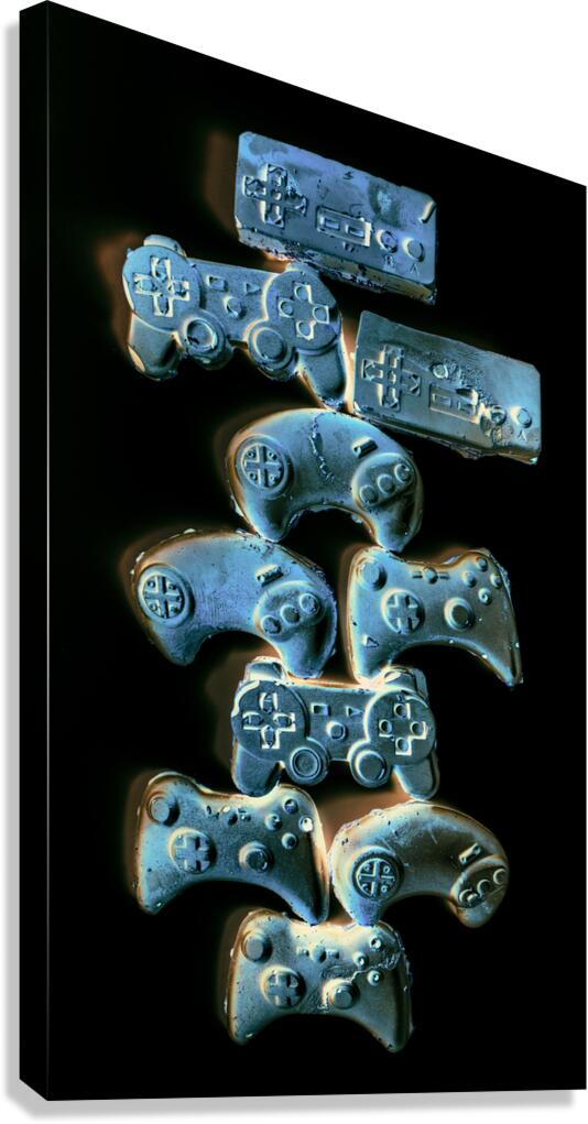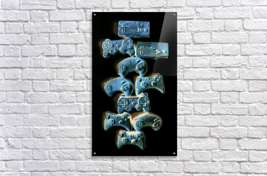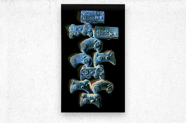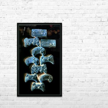 Creative gaming art on a balance out of nostalgic gamer joysticks on black