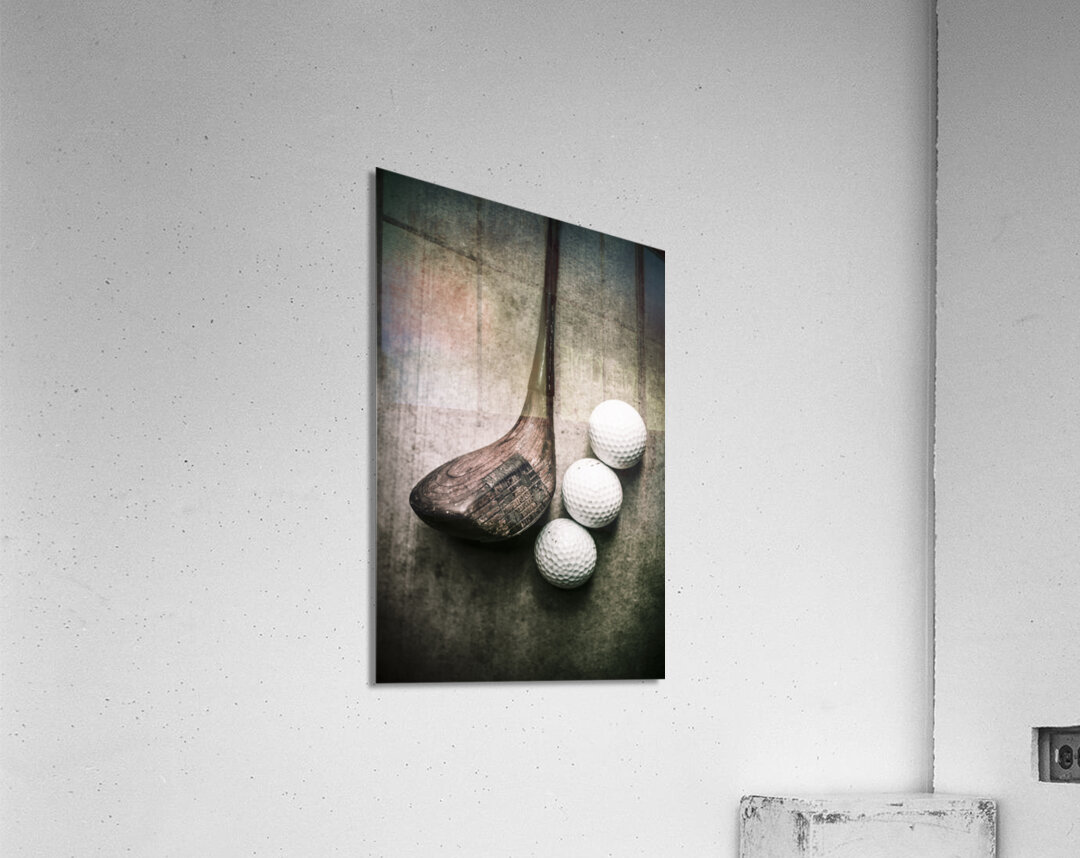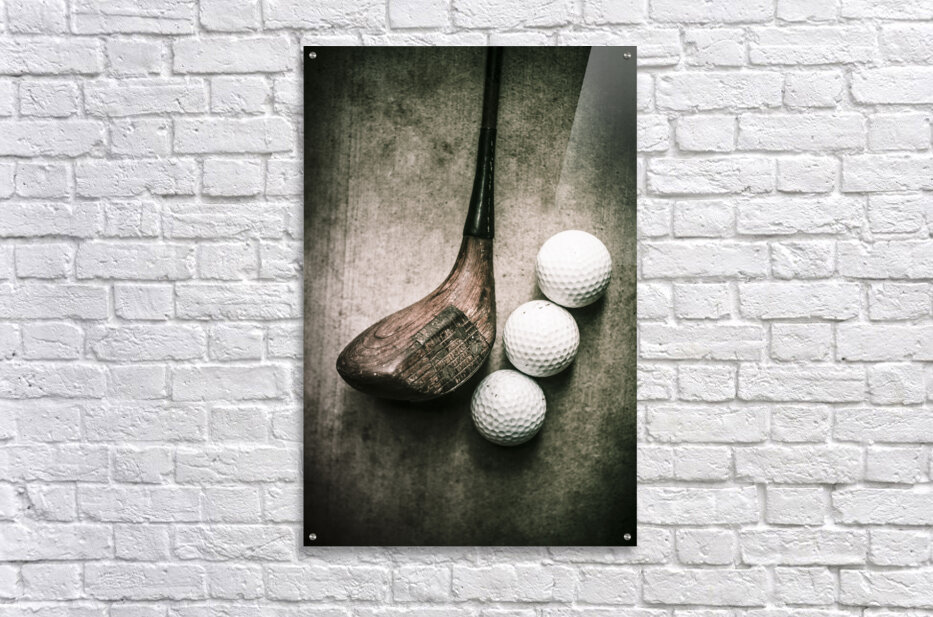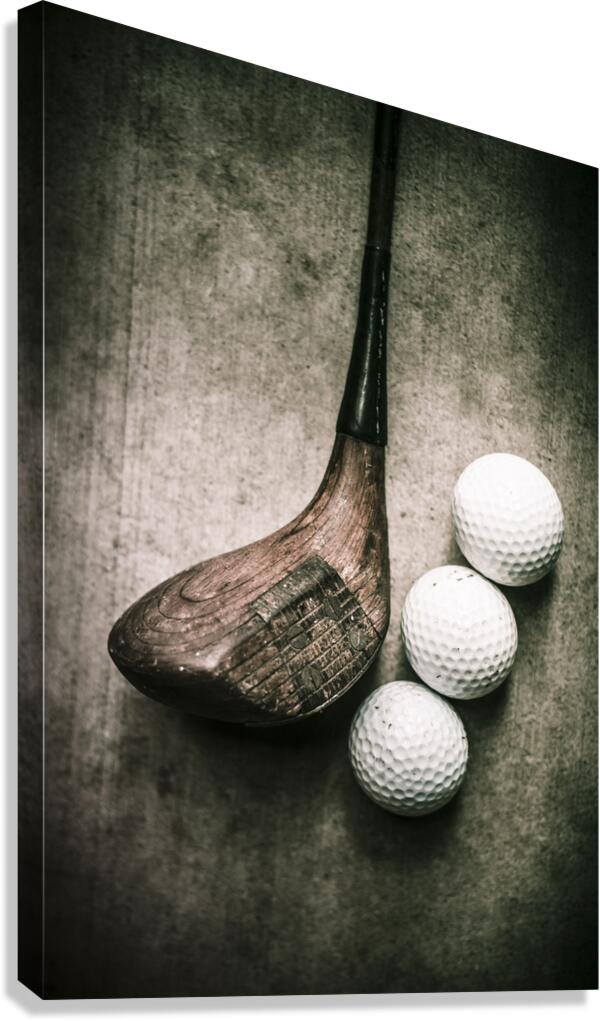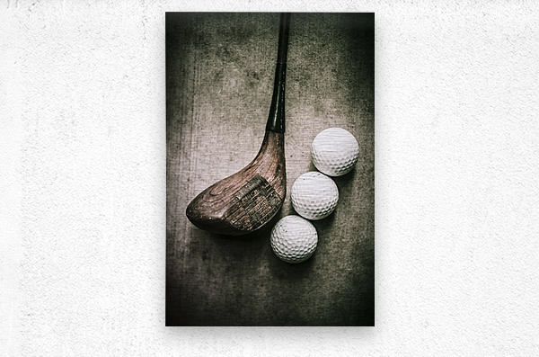 Traditional wooden golf club with balls on grunge cement surface. Art of golfing