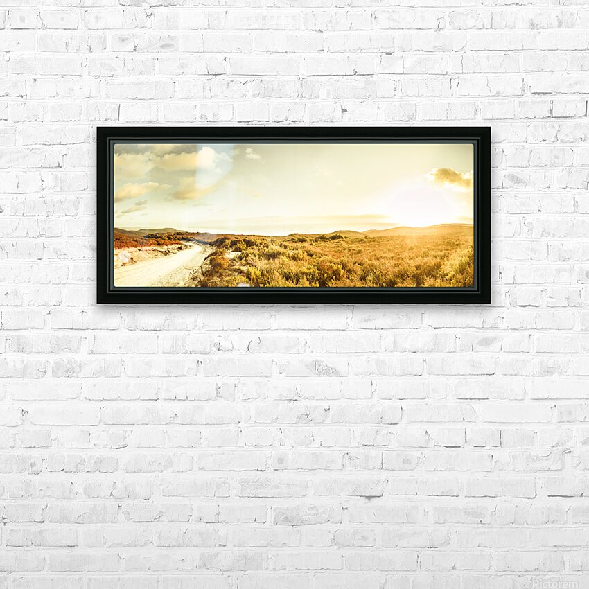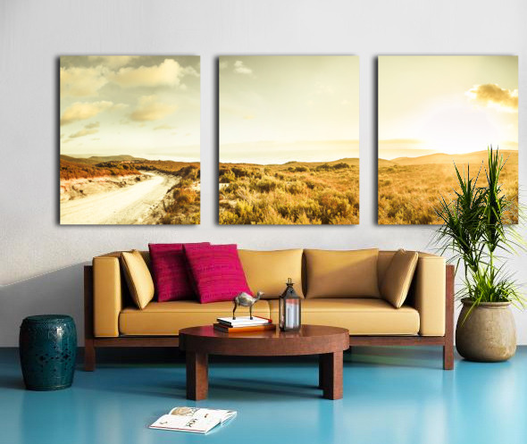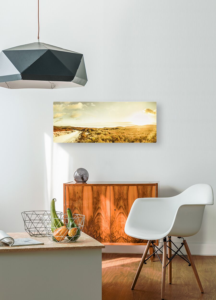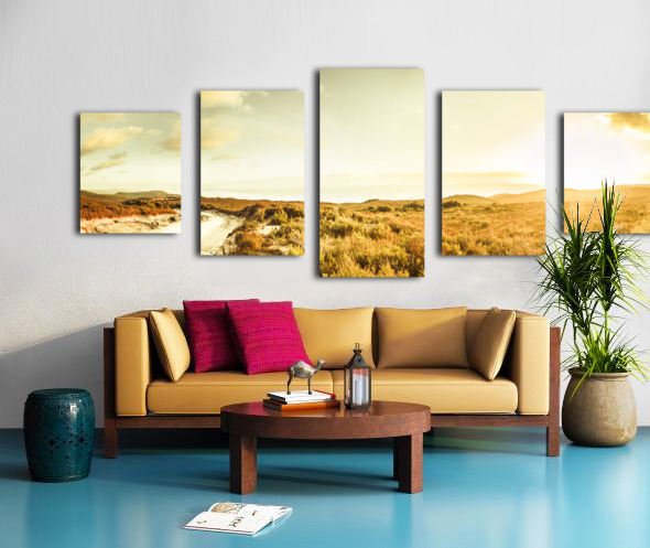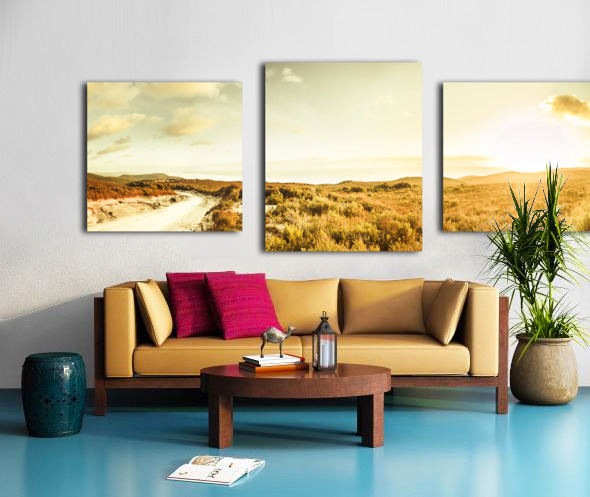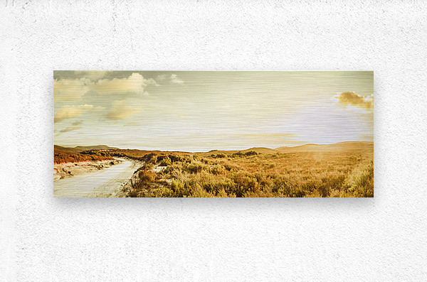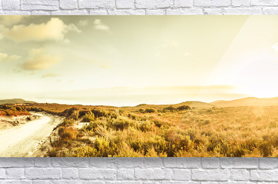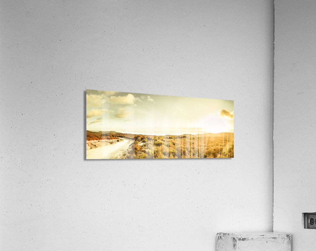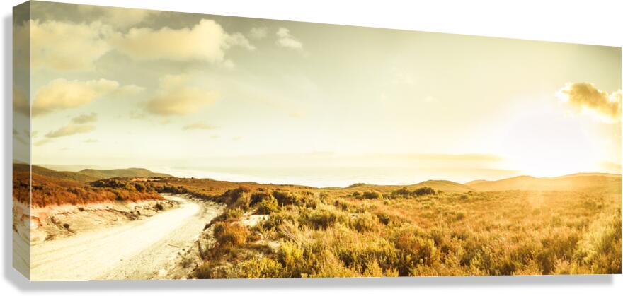 Golden sunset panoramic landscape on a sandy path before a golden beach escape. Trial Harbour West Coast Tasmania Australia