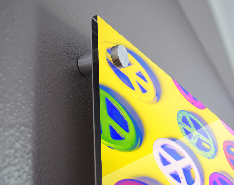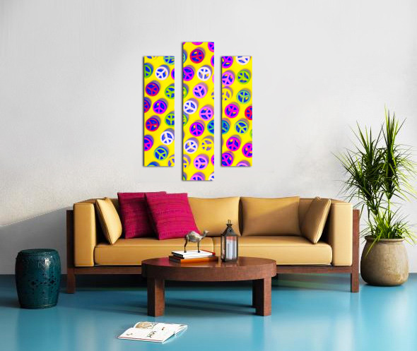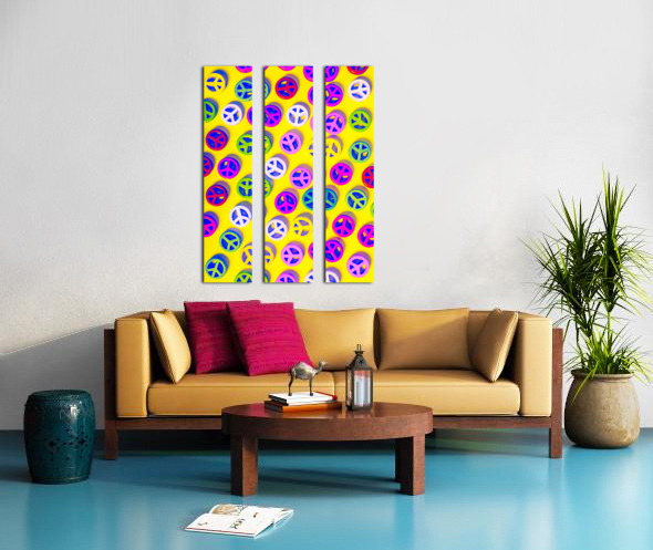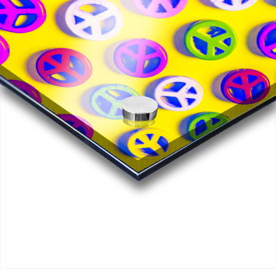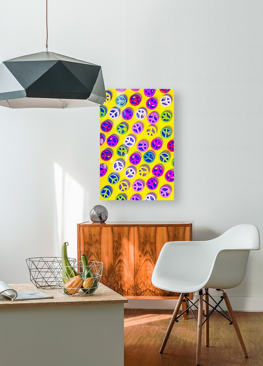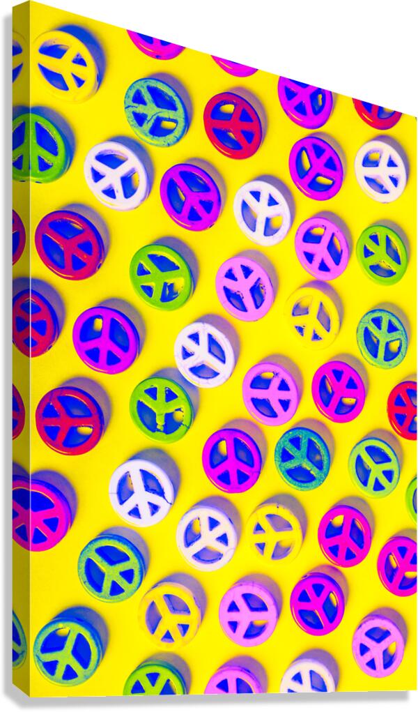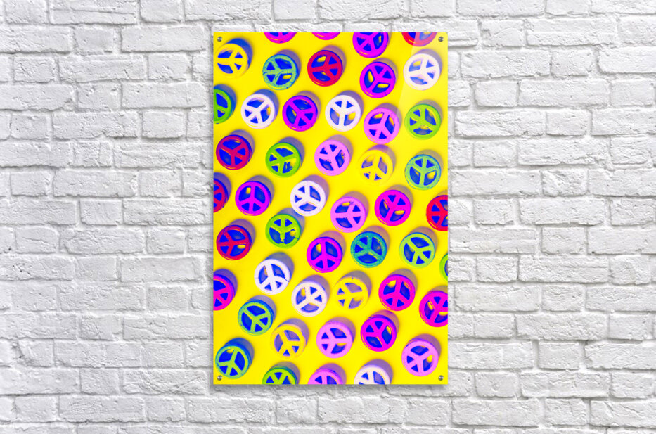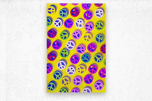 Yellow pop art design on a layout of colorful peace sign pendants. Patterning peace