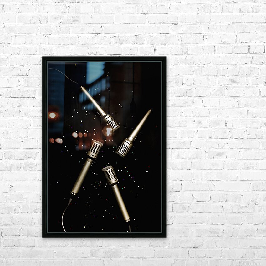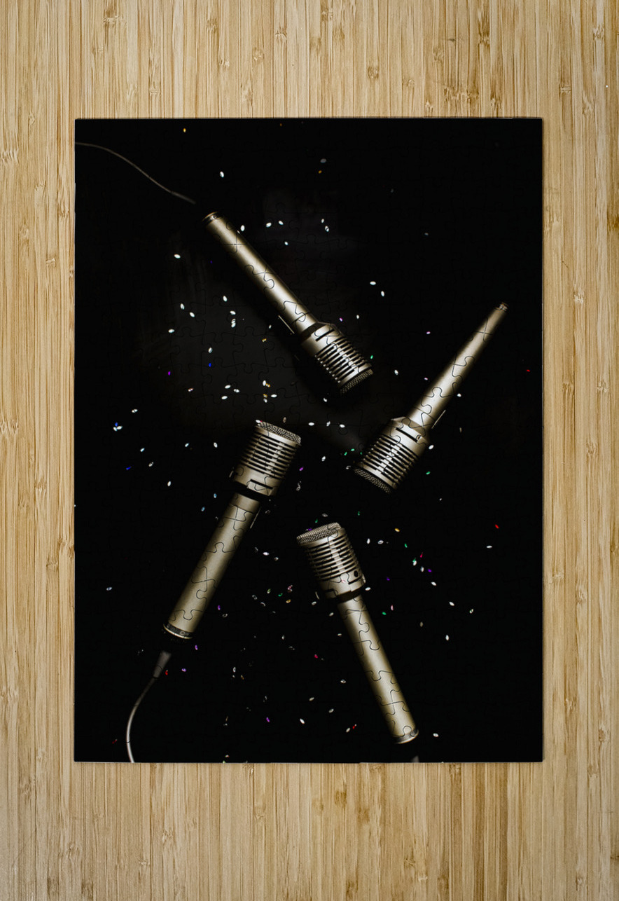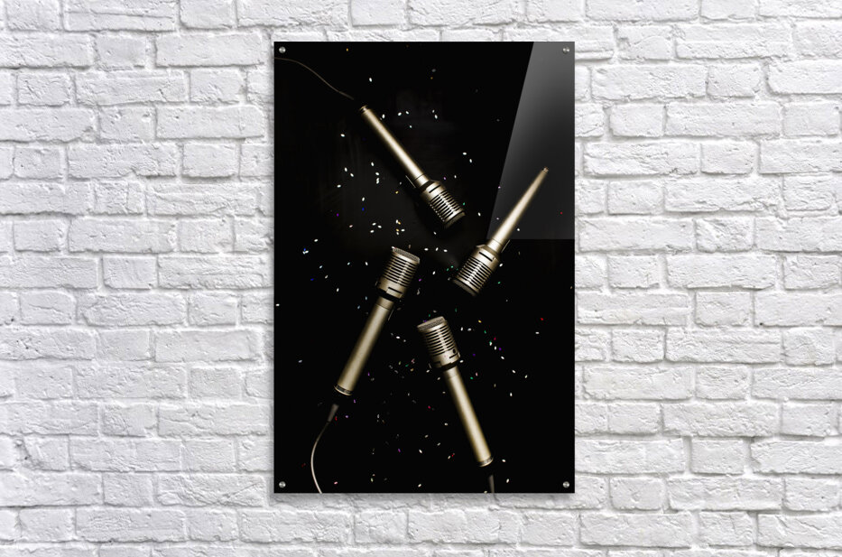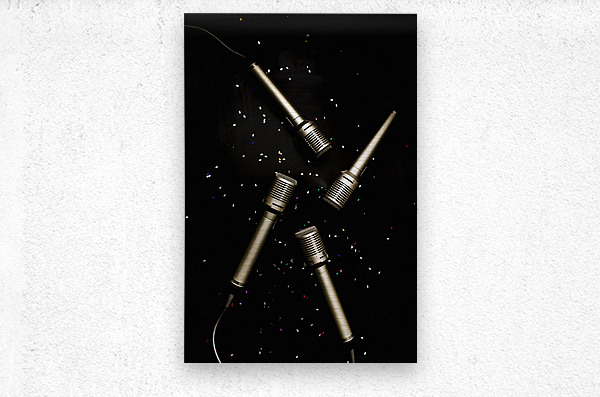 Still life art on a entertaining scene of four microphones on black glitter background. Glitz and glam in performing arts
