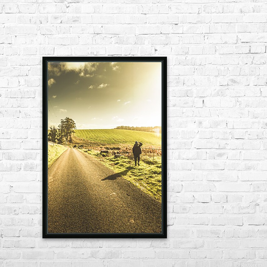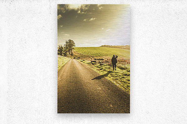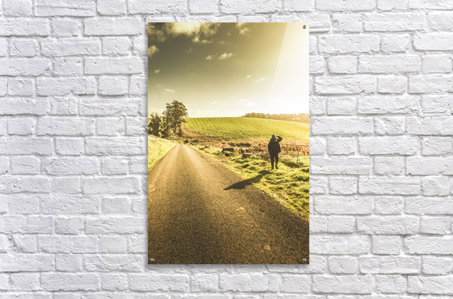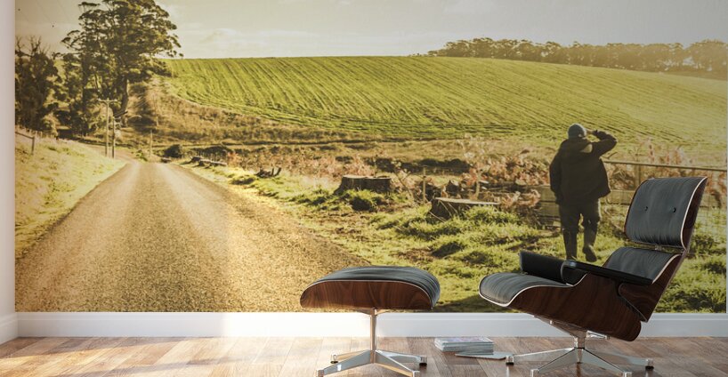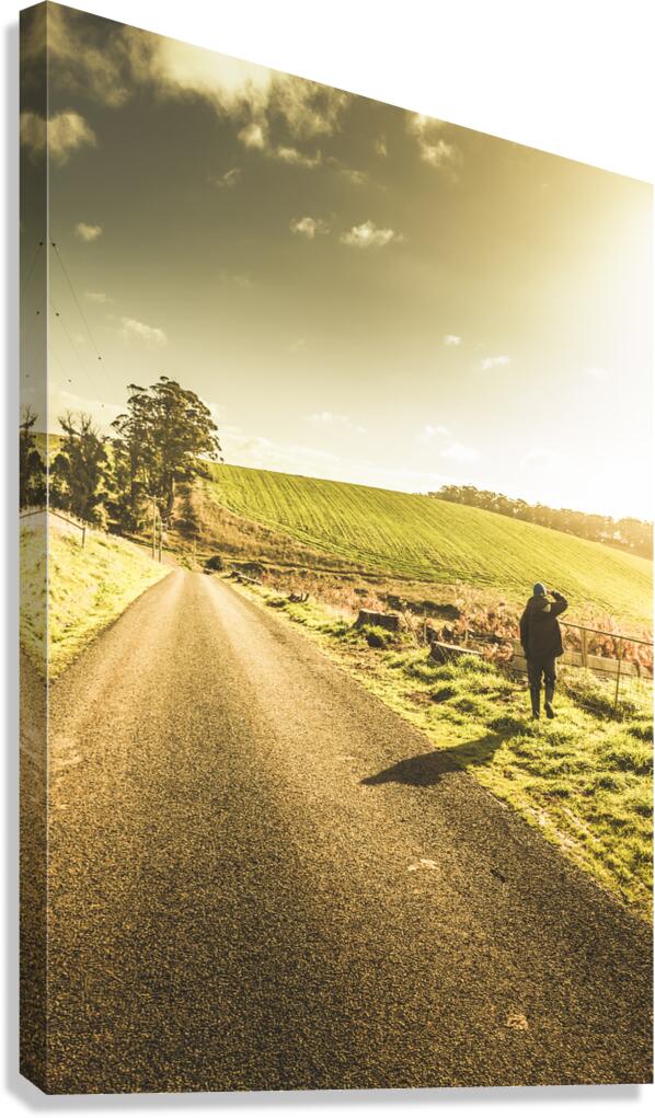 Tranquil travelling scene of a Tasmanian tourist trekking vast wondrous farmlands. Cuprona North-West Tasmania Australia