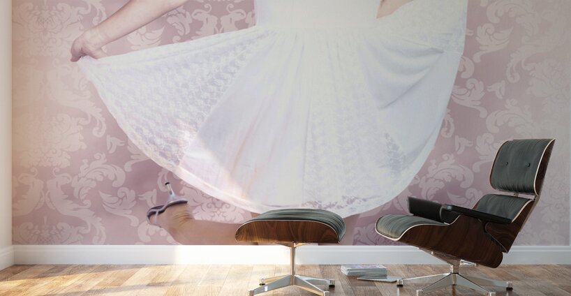Vintage photo of a beautiful pin-up girl dancing in white lacy dress and glamorous brunette hair style. Retro ballerina v