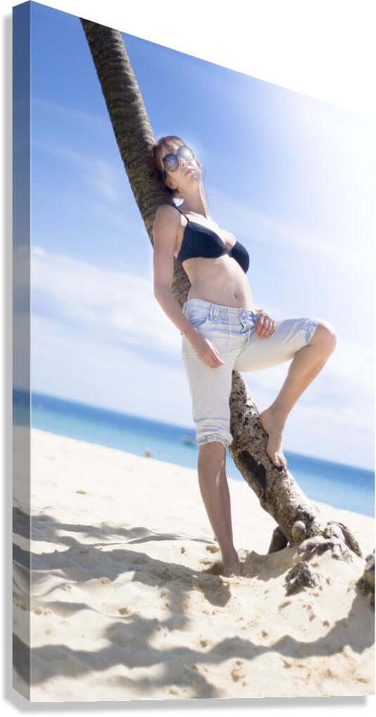 Attractive Young Woman With Bikini Top Leaning Against Palm Tree Trunk On Sandy Beach In Tropical Island Paradise