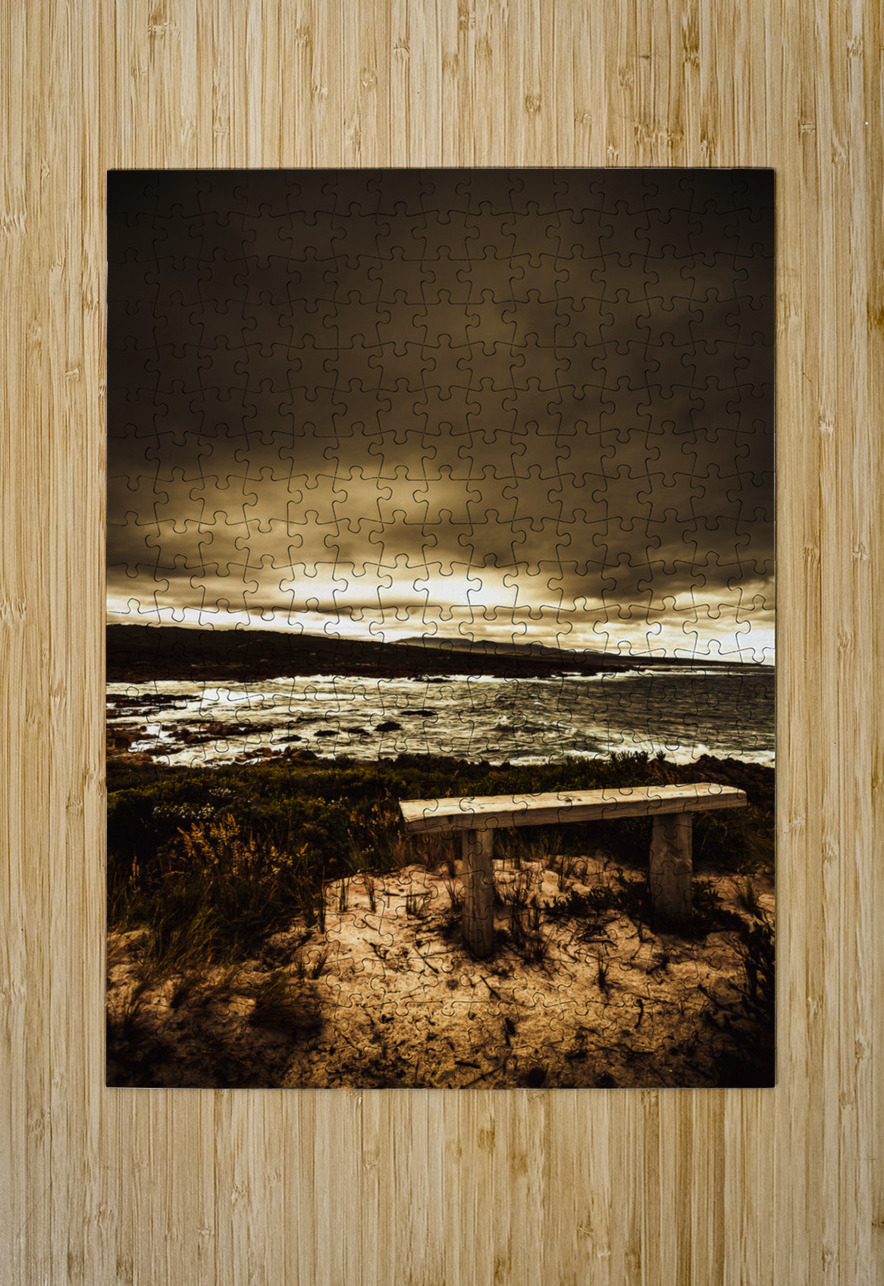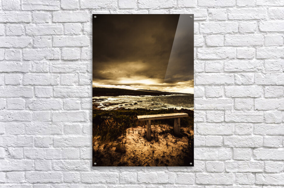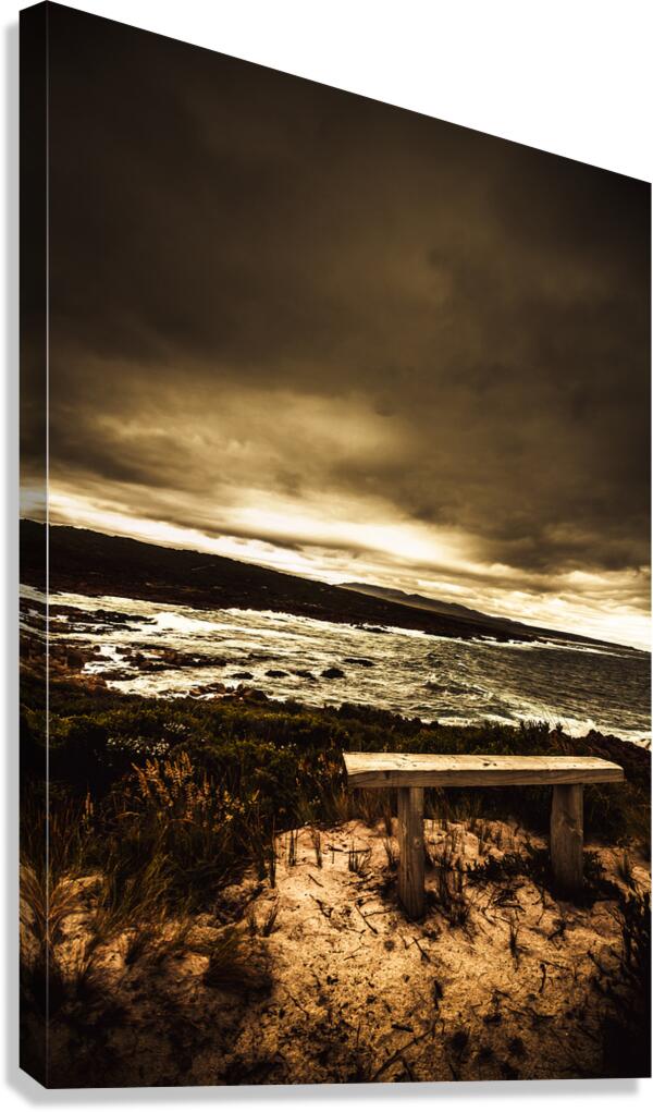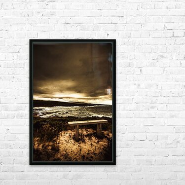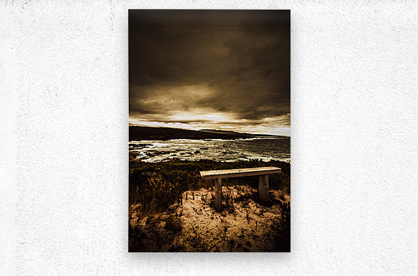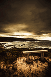 Dramatic fine art landscape on a seat lookout over a dark seascape in west coast Tasmania. Captured Granville Harbour Australia