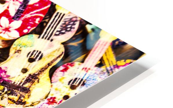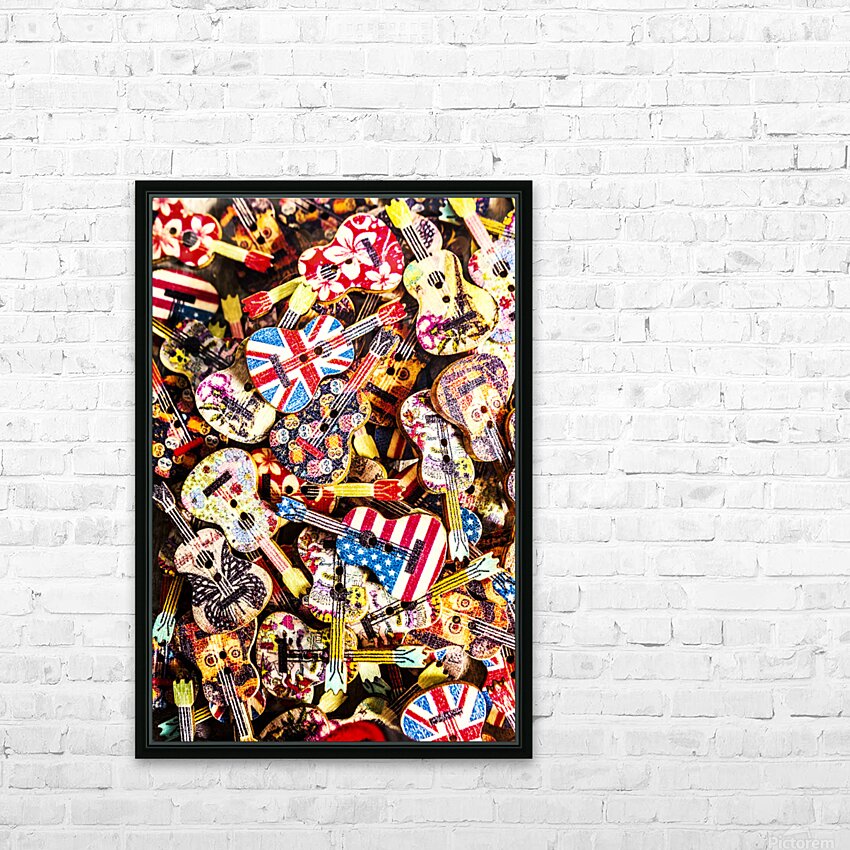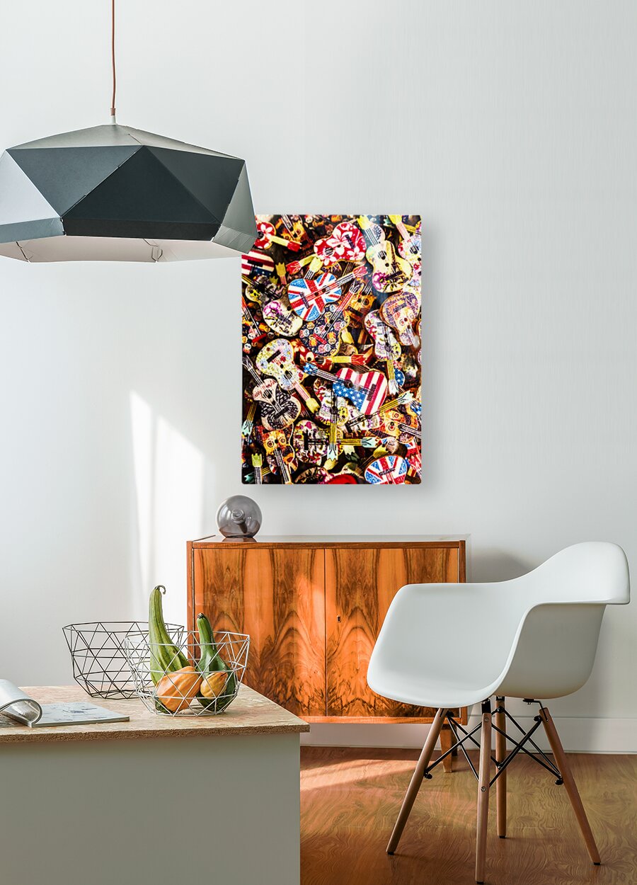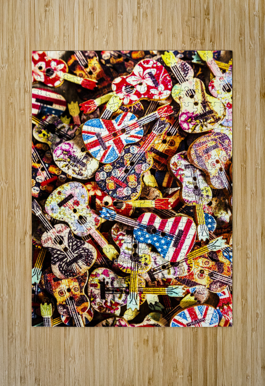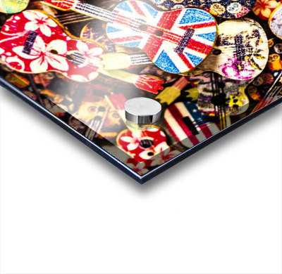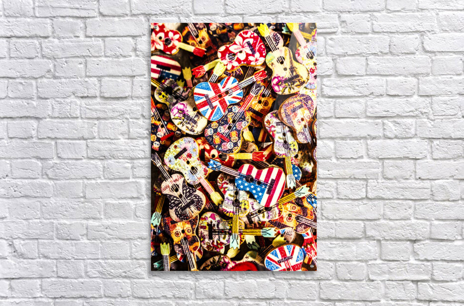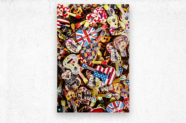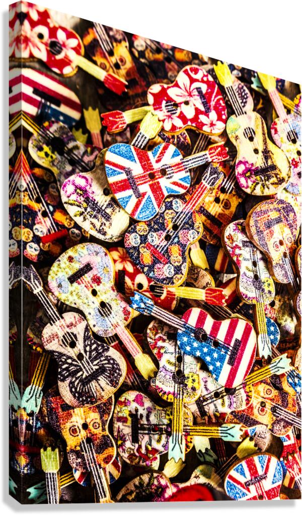Creative abstract still-life scene on a scattered array of pop art guitars in retro yet contemporary glam. A colour instrumental