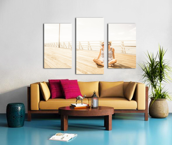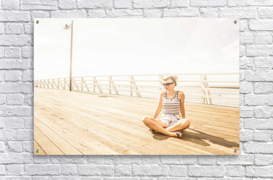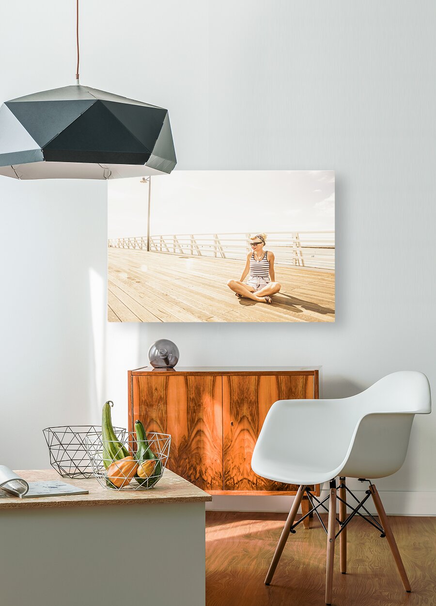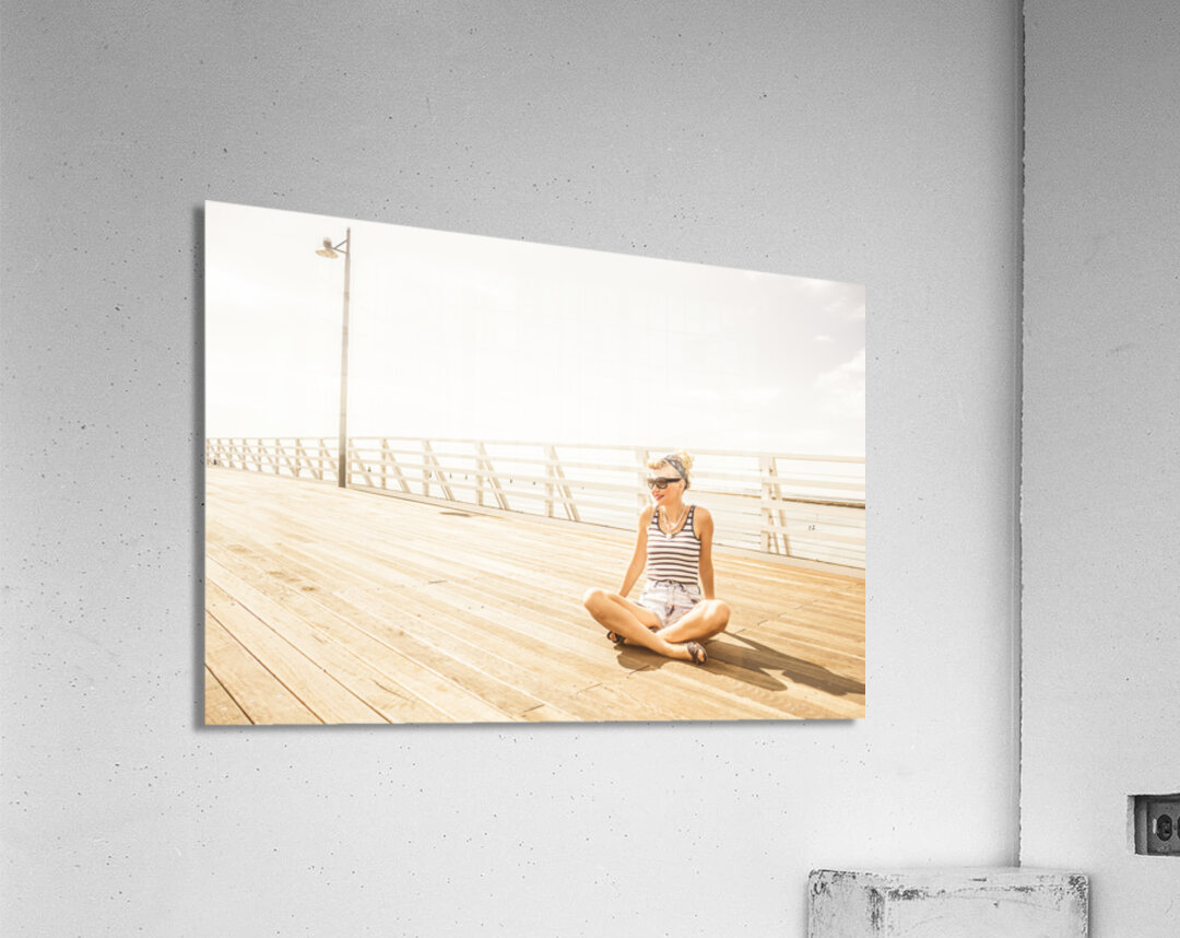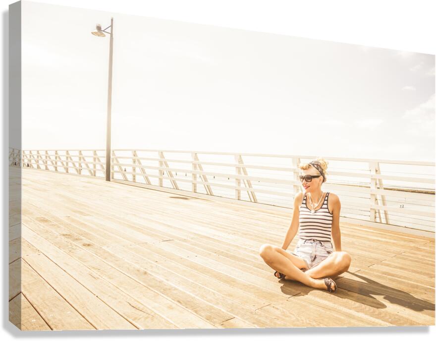Dreamy high-key portrait of a relaxing woman sitting crossed legged on a wooden jetty. Marine Serenity