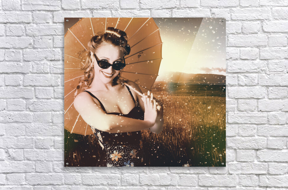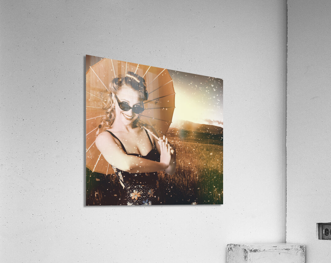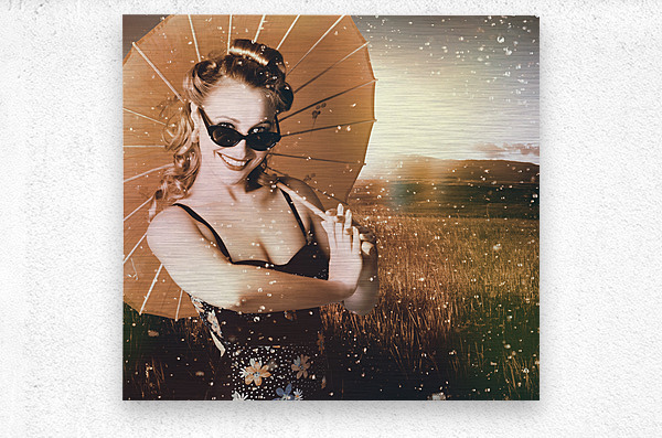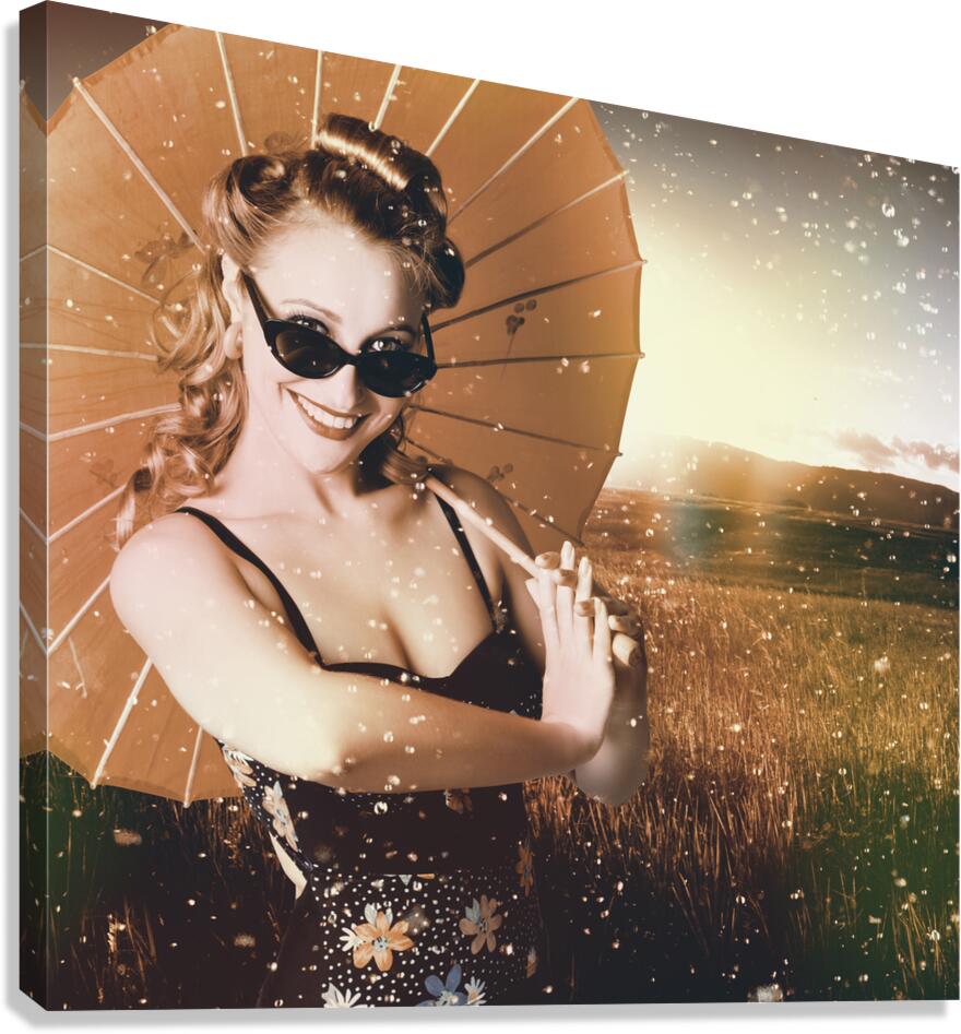 Fine art portrait of an elegant vintage American pin-up girl holding parasol in droplets of falling rain when walking in a summer field