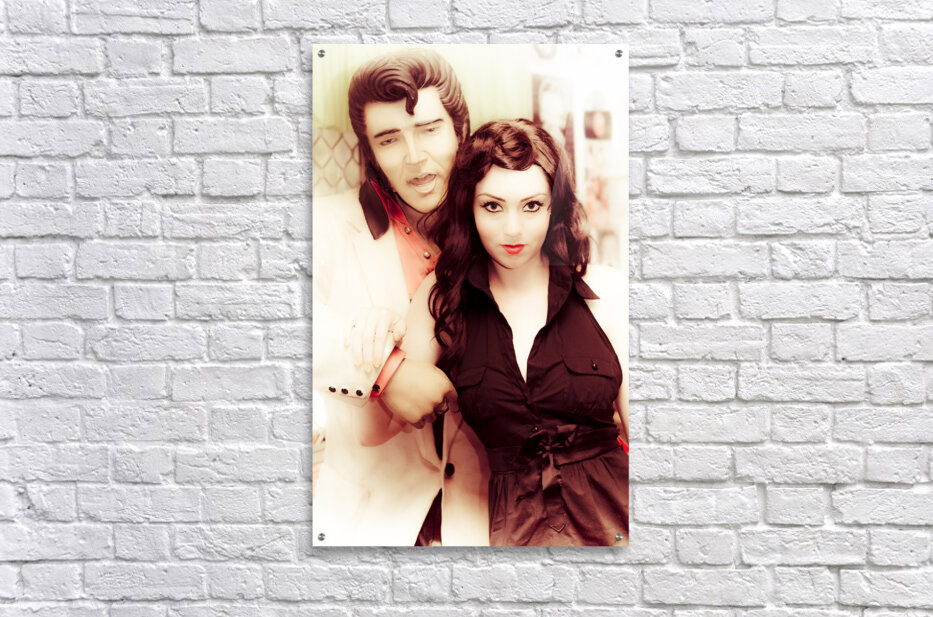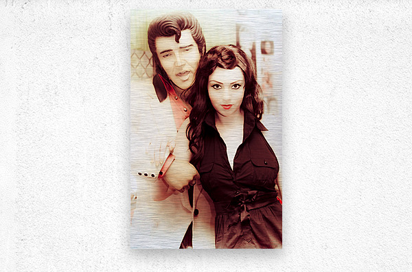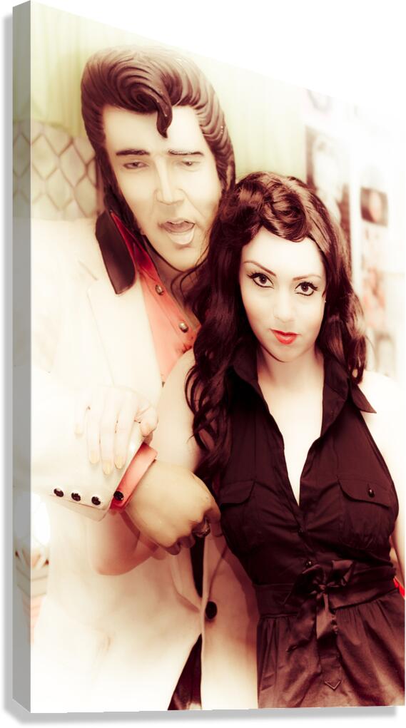 Attractive Young Retro Rocking Woman Posing With A Statue Of Elvis The King Of Rock In An Old Fashion Portrait From A Bygone Era