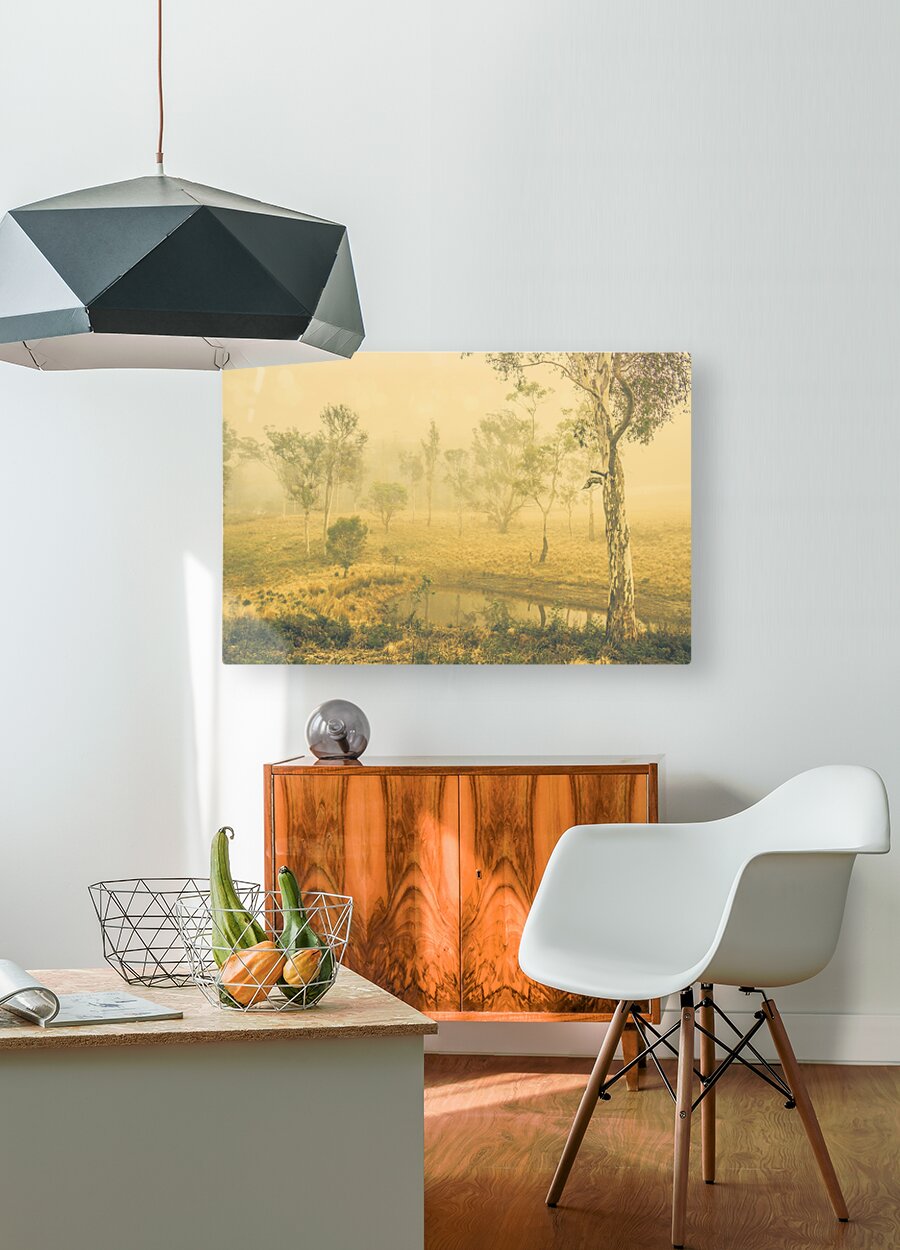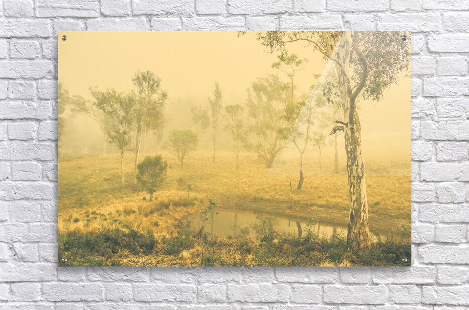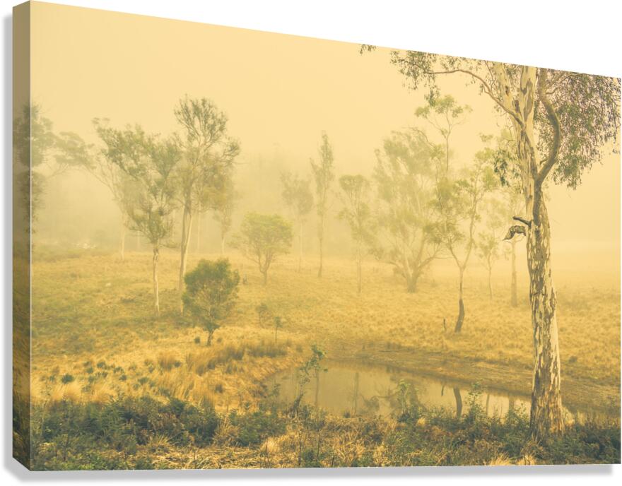 Fascinating dream like setting of a foggy lake surrounded by Australian native trees. Mystical lake taken in Pelham Tasmania Australia