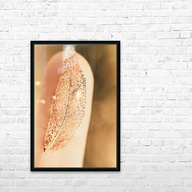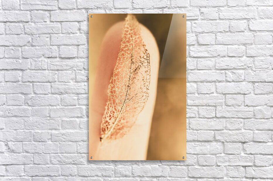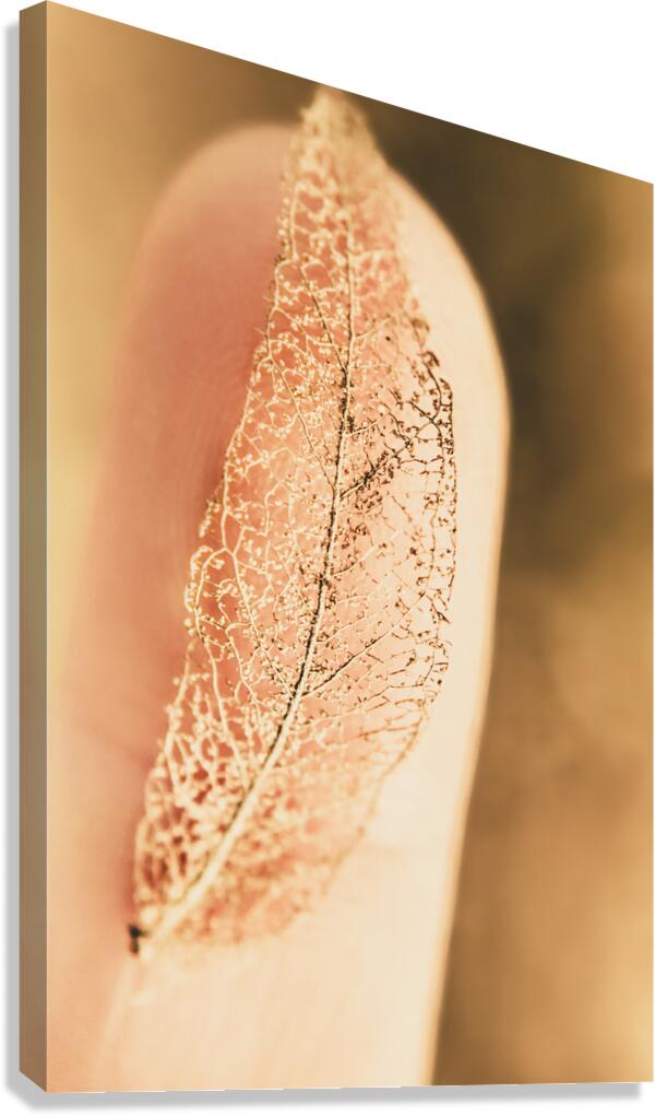 Closeup on a persons finger holding a beautiuful skeletal structure of a decaying leaf with intricate patterns and fine detail. Autumn fragility