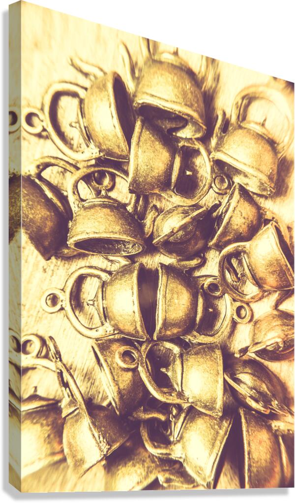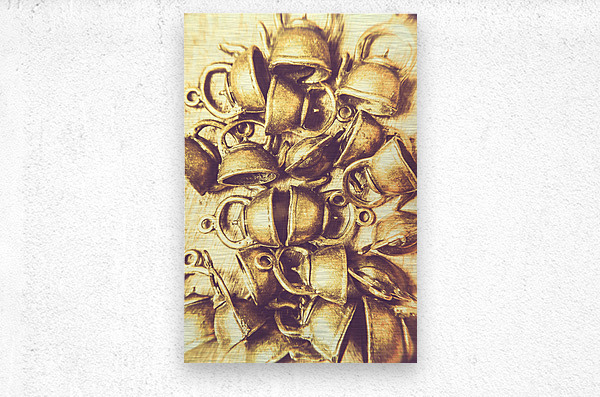 Decorative kitchen art on a display of mixed and scattered coffee pots shaded in tones of old-fashioned fun. Antique cafe composition
