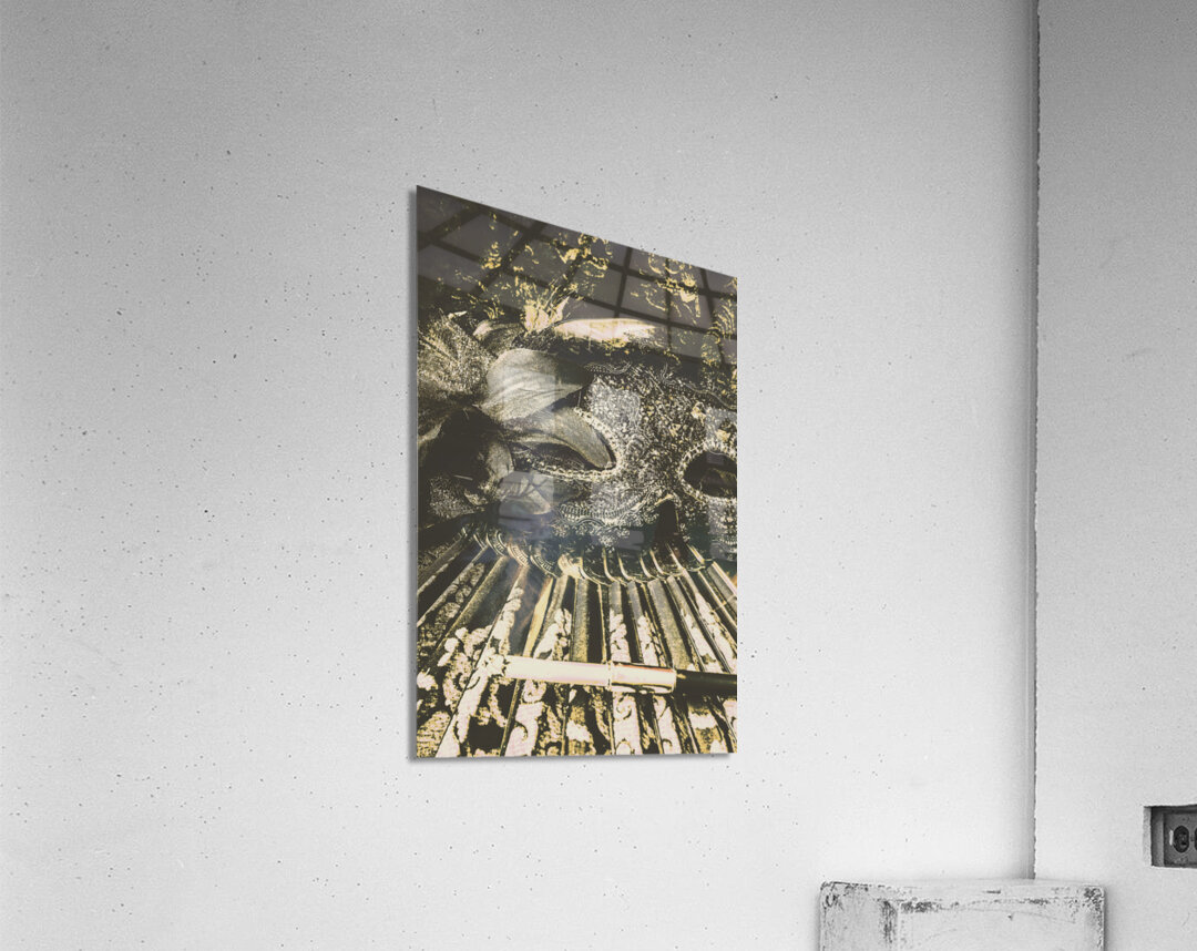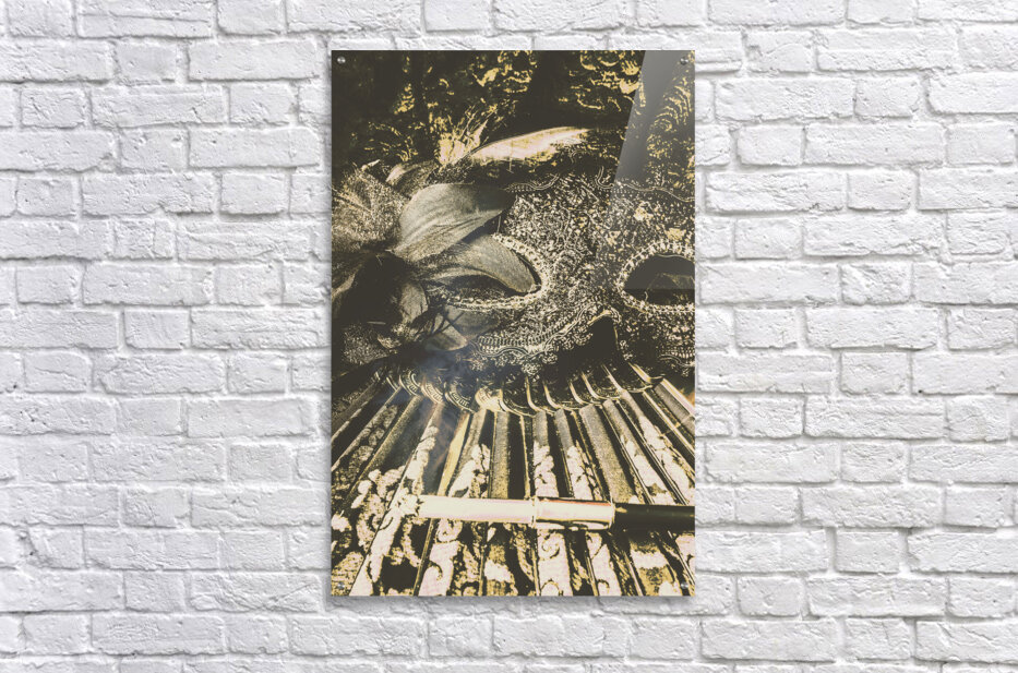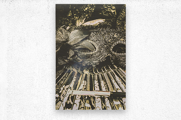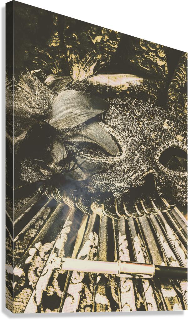 Antique still life artwork on a stage show mask with smoke and fan in a theatrical veil of opulence. Vintage cabernet show