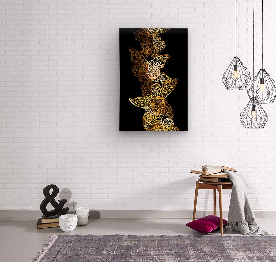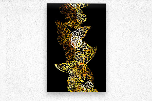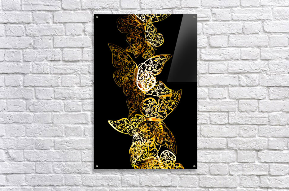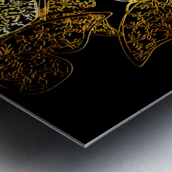 Exotic golden butterflies in a shiny print on dreamlike black. The shimmer