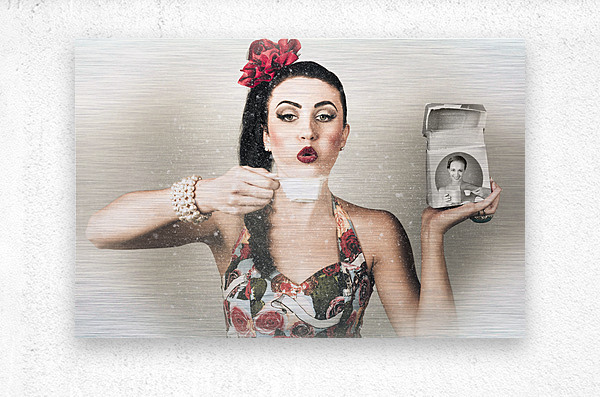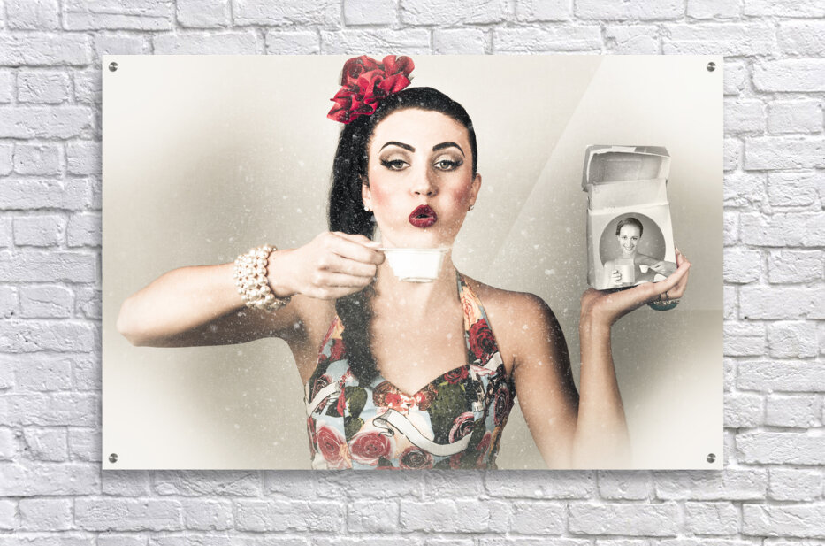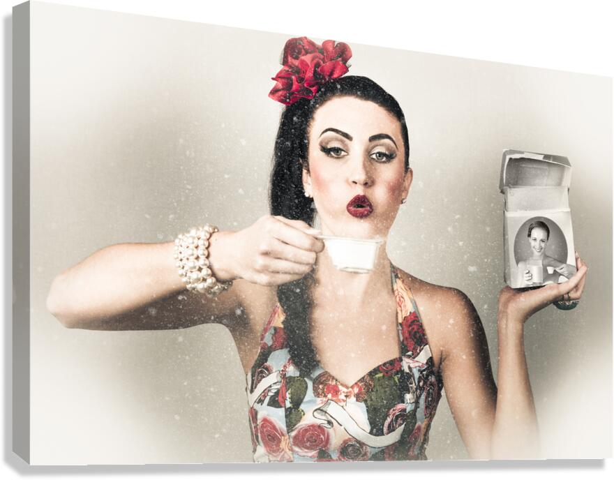 Vintage portrait of a pinup housewife puffing on a scoop of laundry washing powder. Old fashioned cleaning advertising