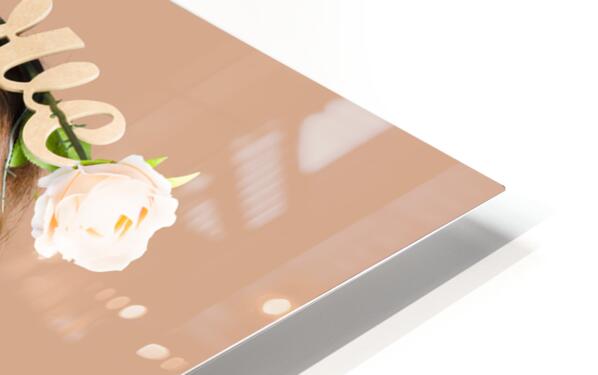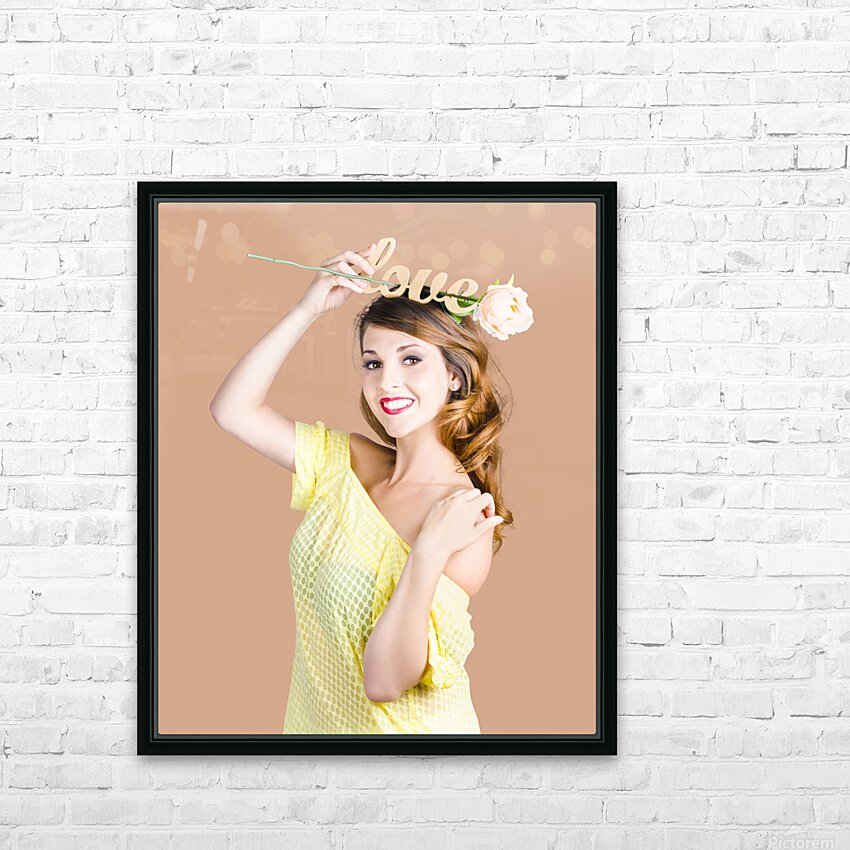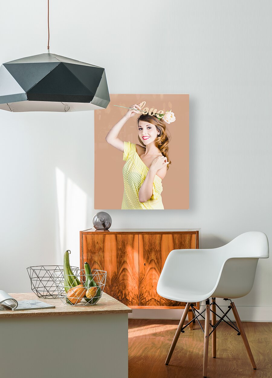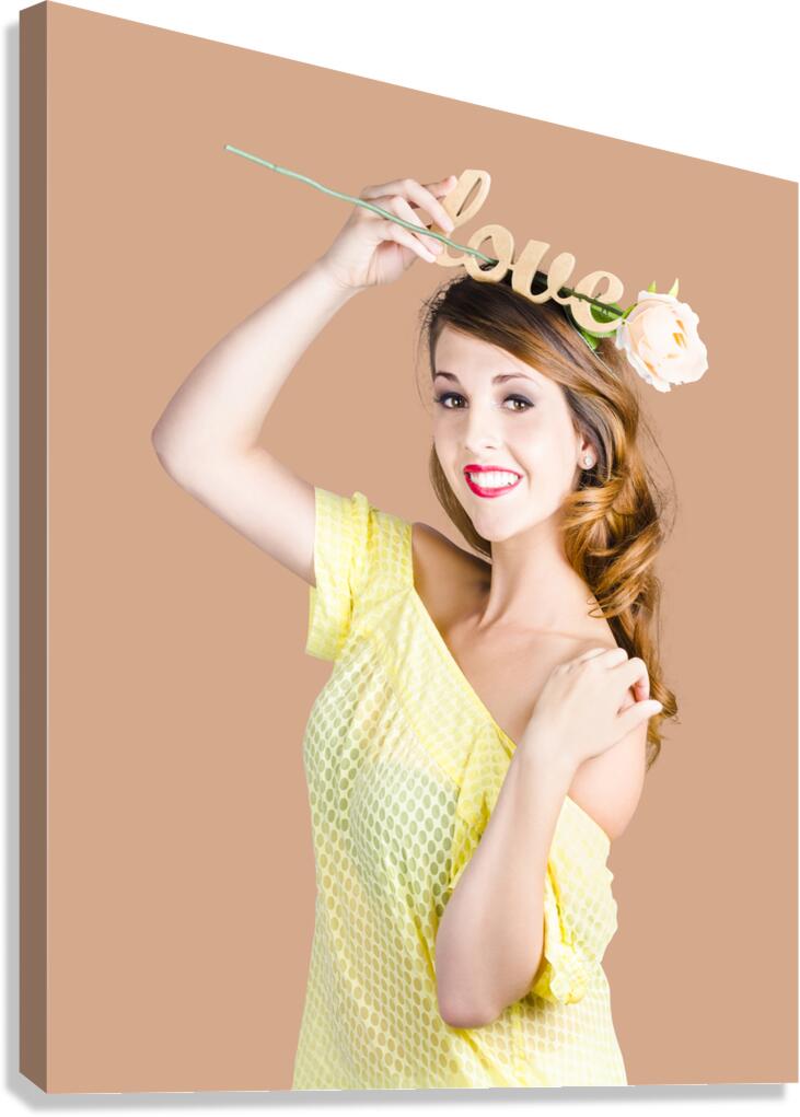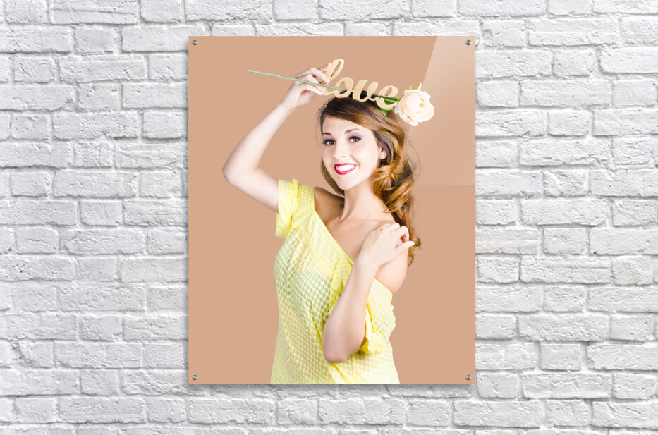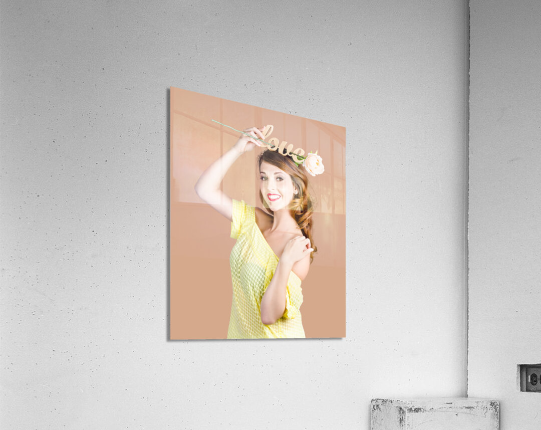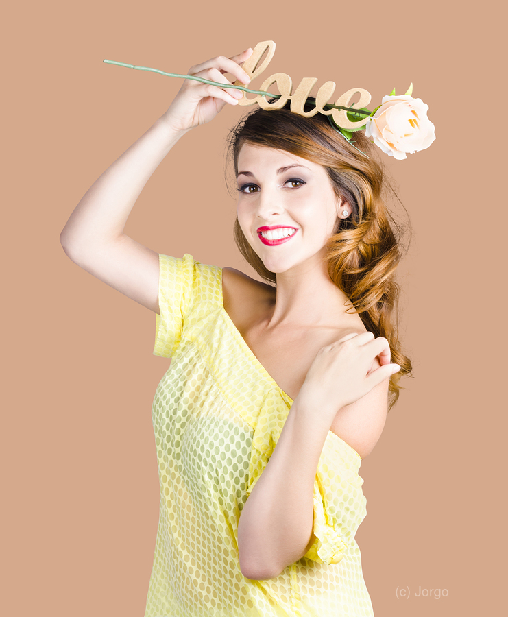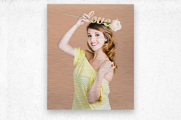 Beautiful woman in gold colored dress holding message of love above head accompanined by a single white rose. Head over in love concept.