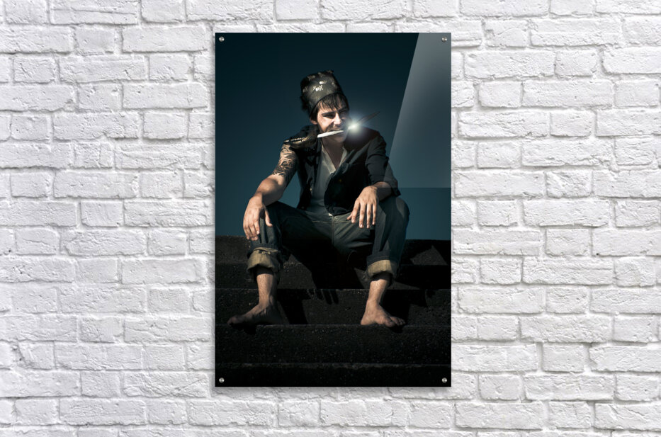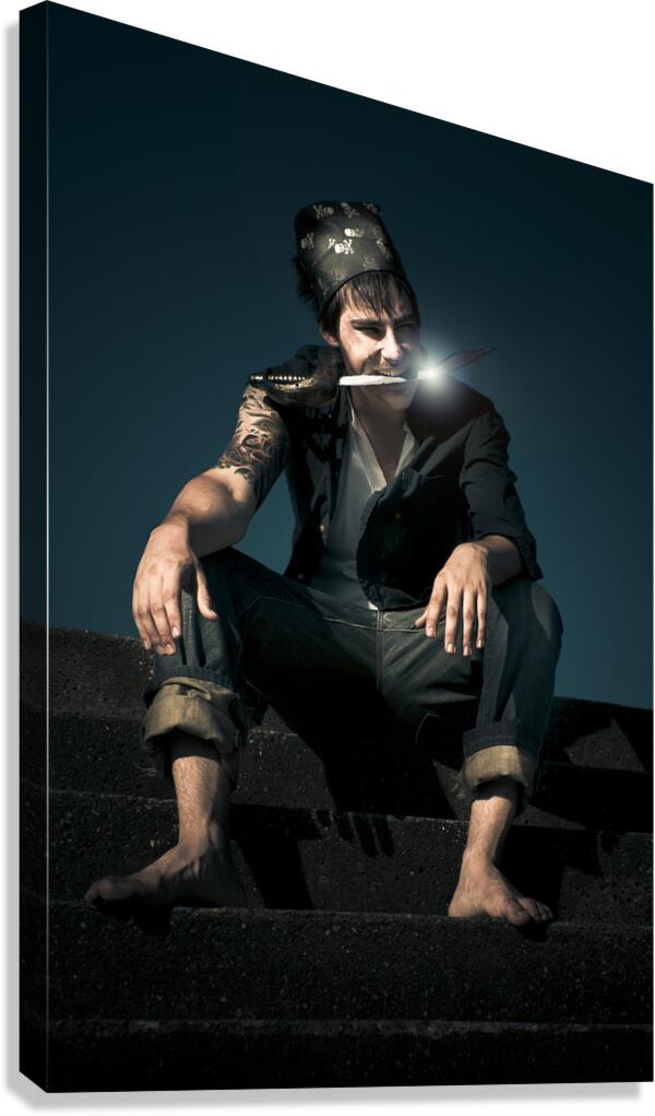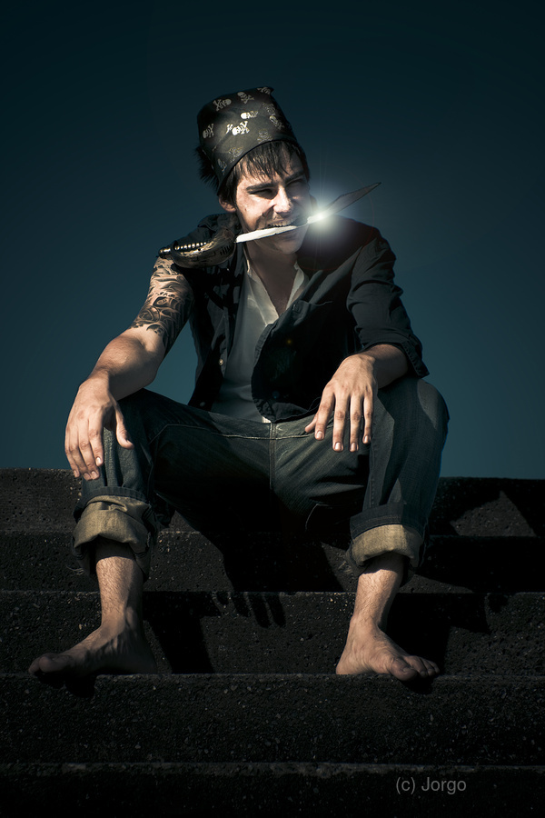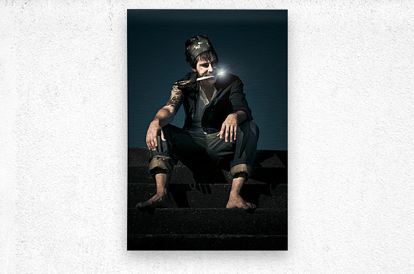 Dark And Scary Portrait Of A Evil And Devious Pirate Sitting On A Stairwell During Twilight With Moonlight Reflecting On A Knife Held In His Mouth