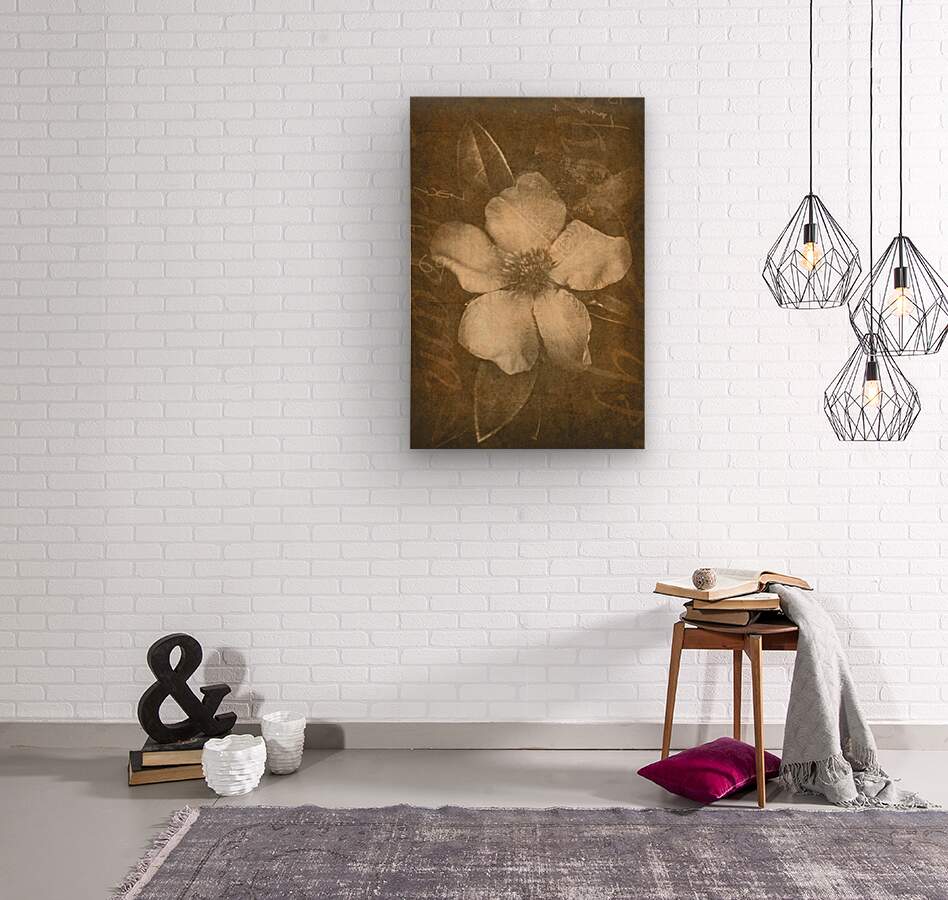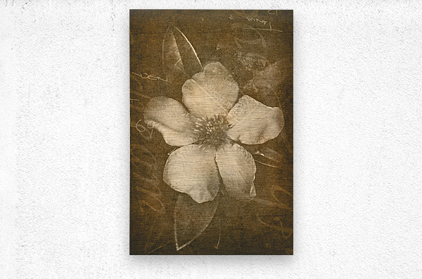 Brown vintage postcard styled paper flower with abstract text postage marks and texture. Home decor artwork