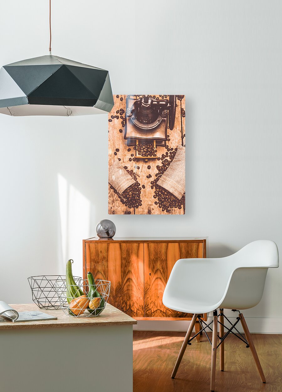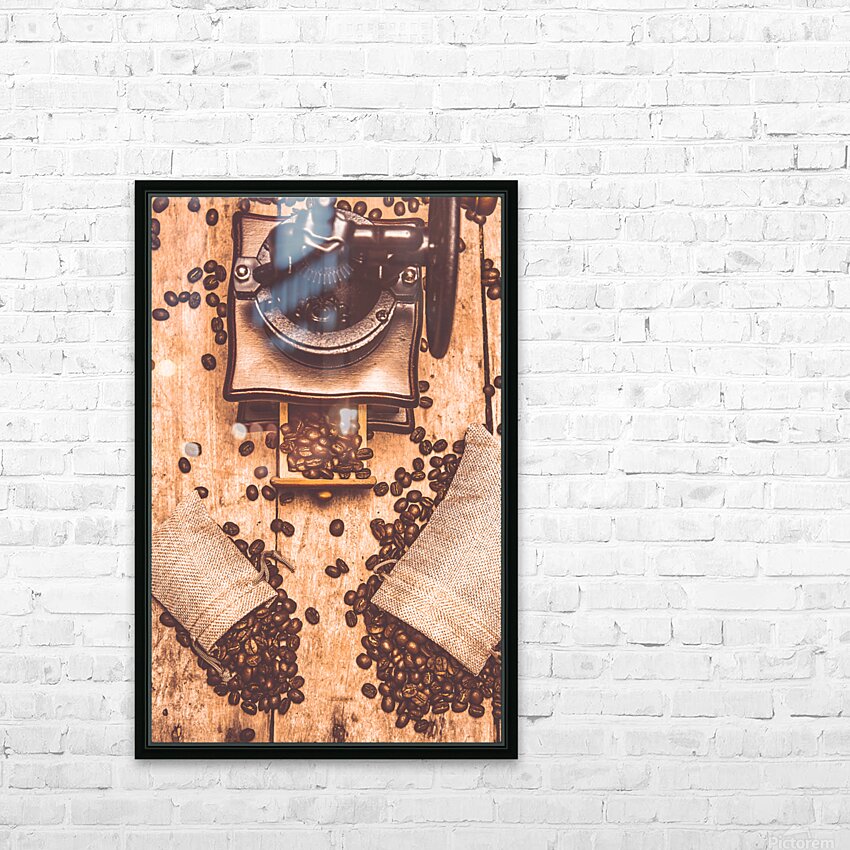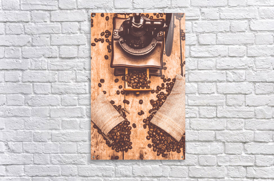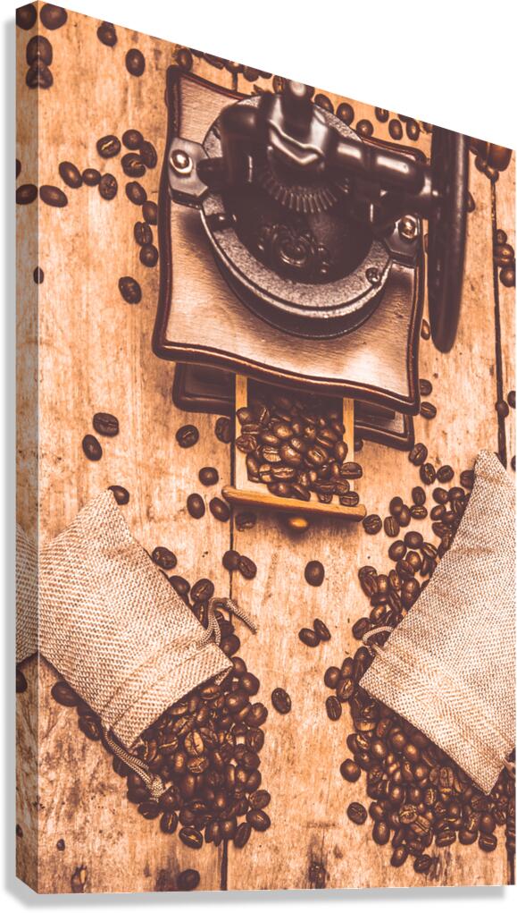 Vintage grinder with sacks of coffee beans Picture Frame Printing