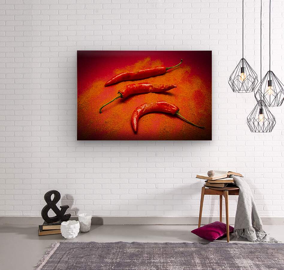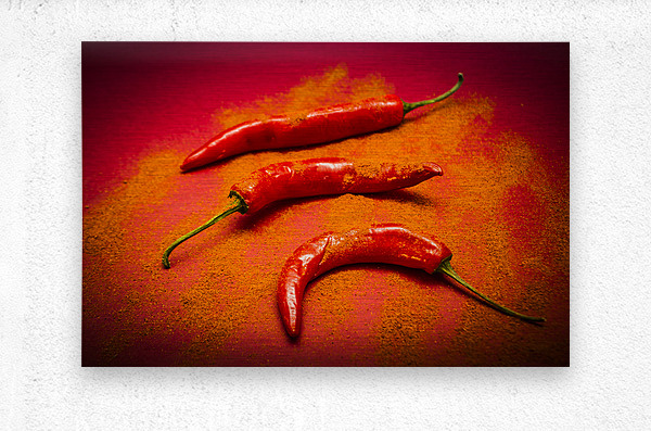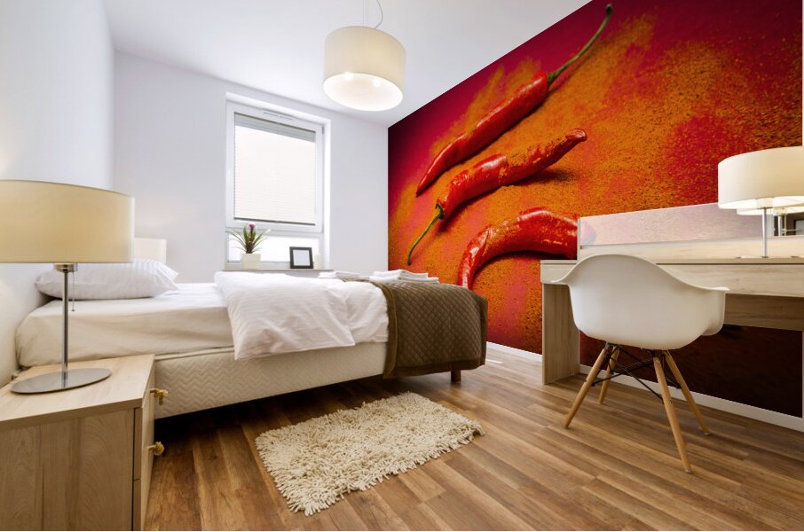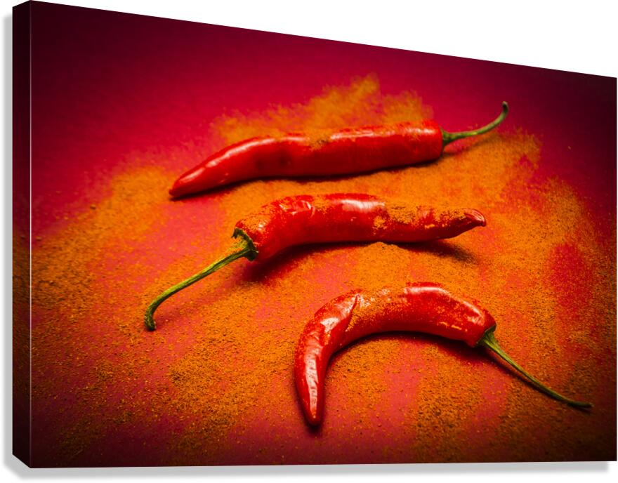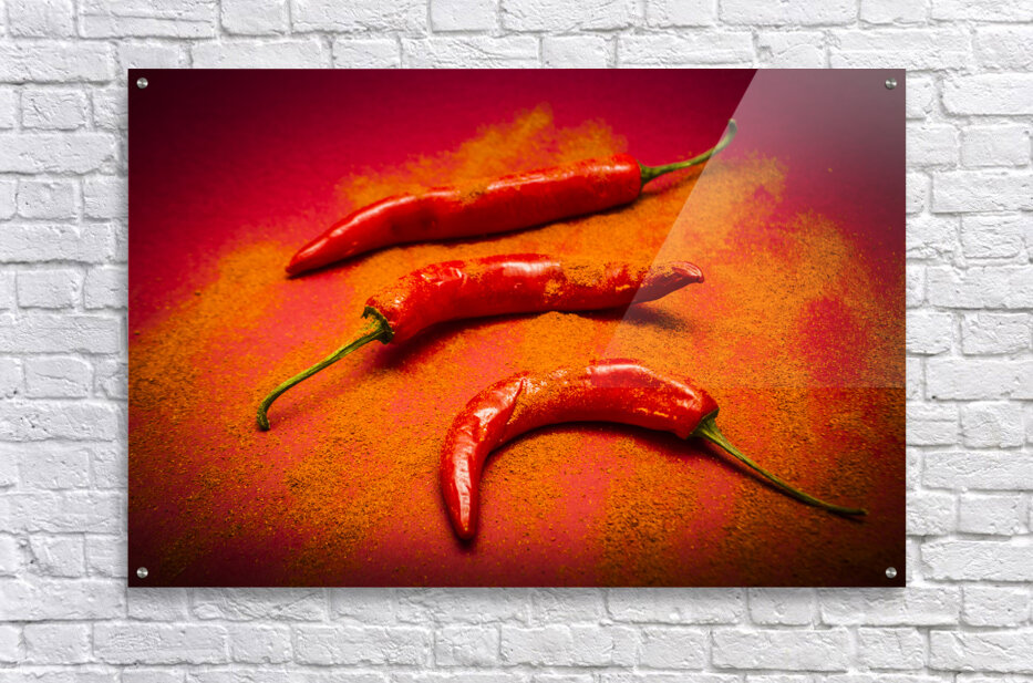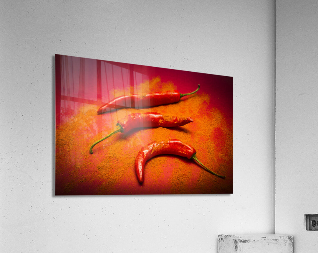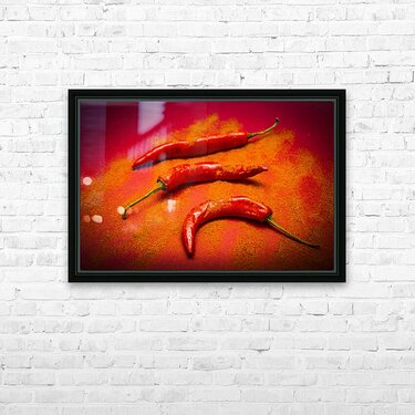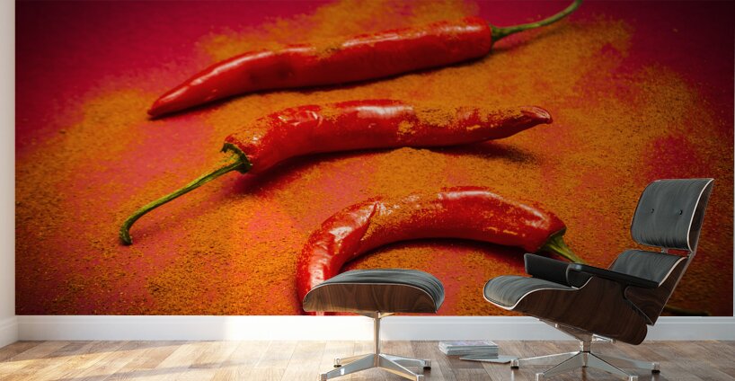 Curry shop art on a red chilli pepper pile being seasoned in hot chili powdered flakes on red kitchen background