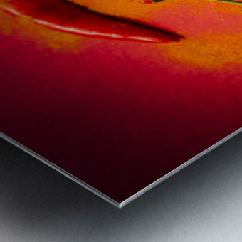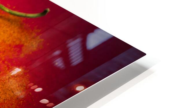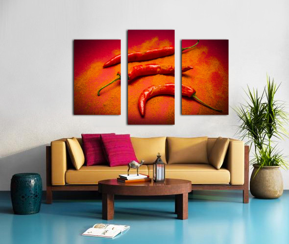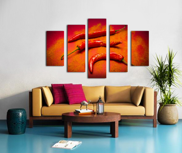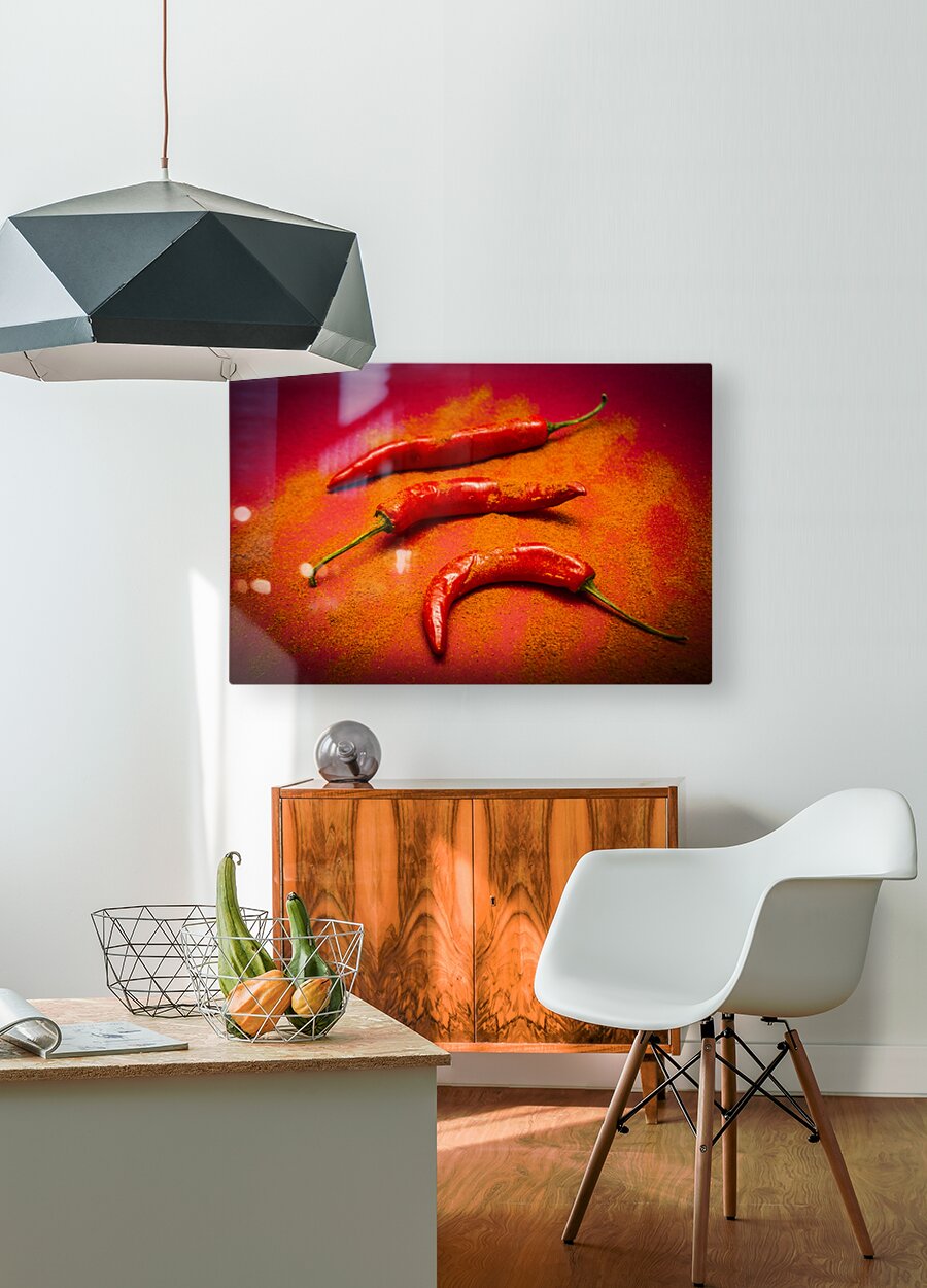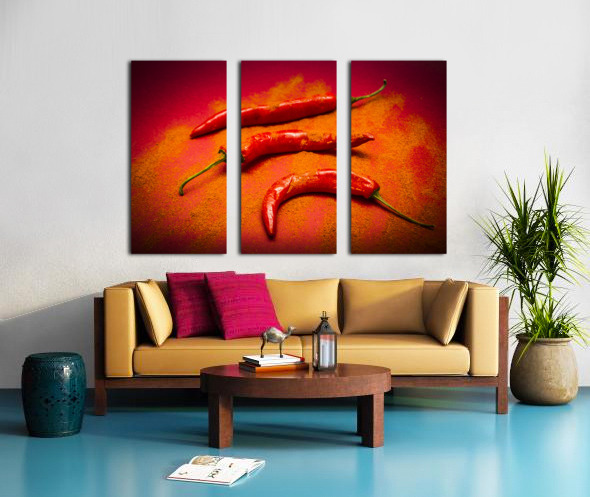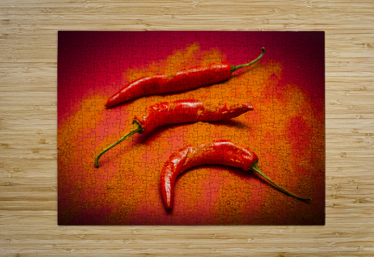 Curry shop art on a red chilli pepper pile being seasoned in hot chili powdered flakes on red kitchen background