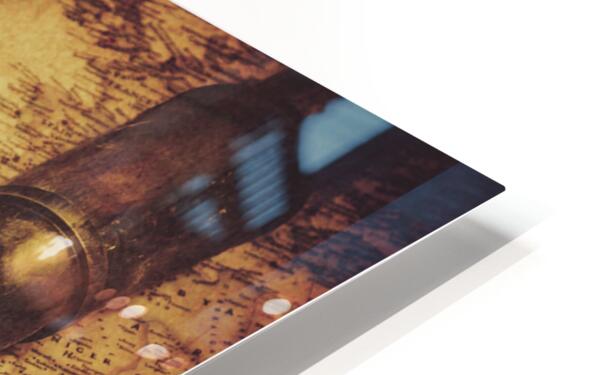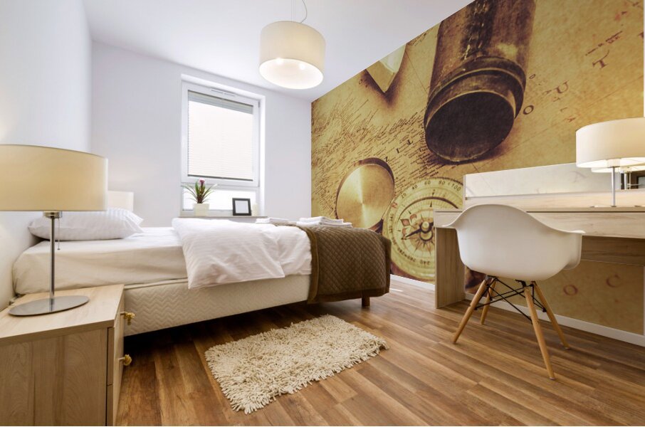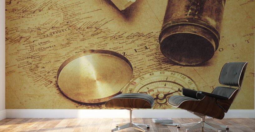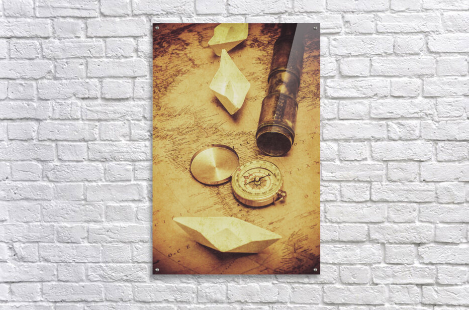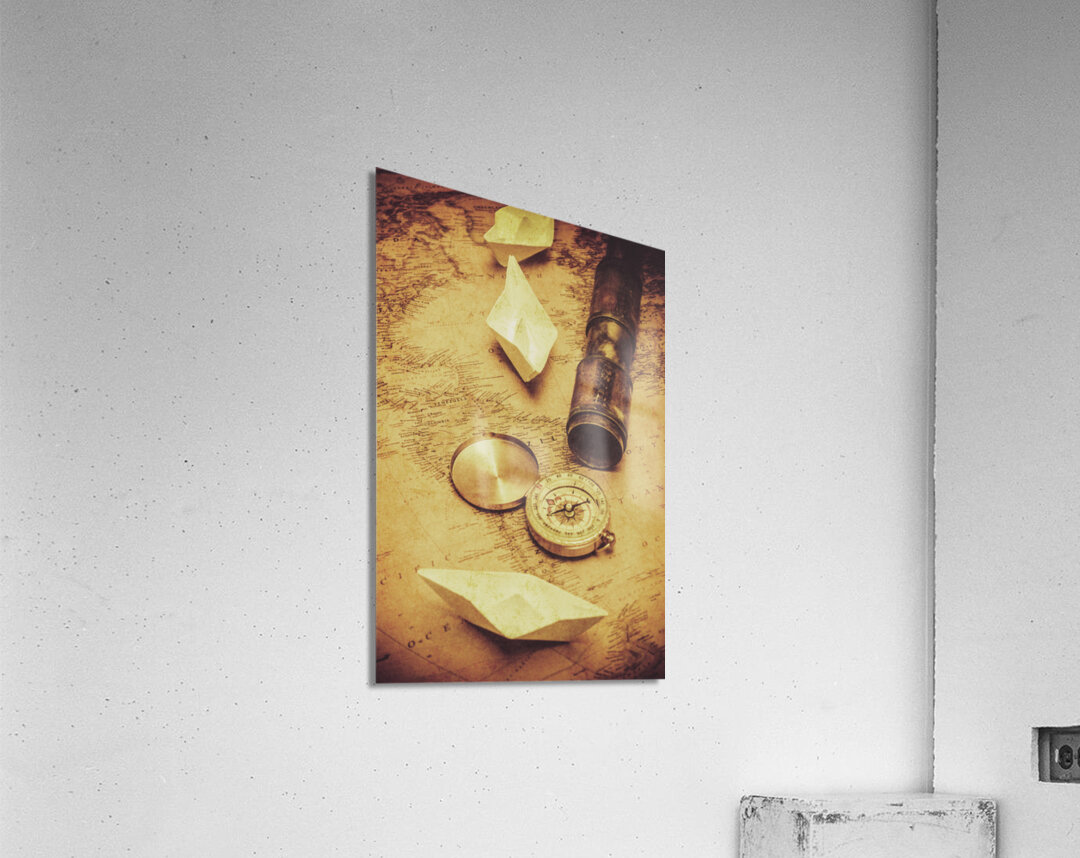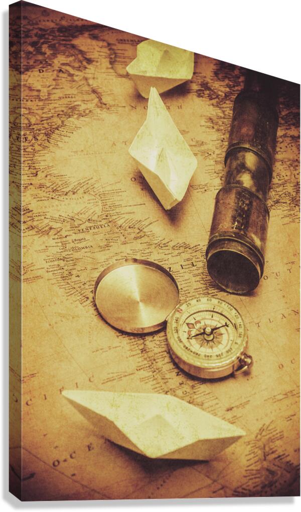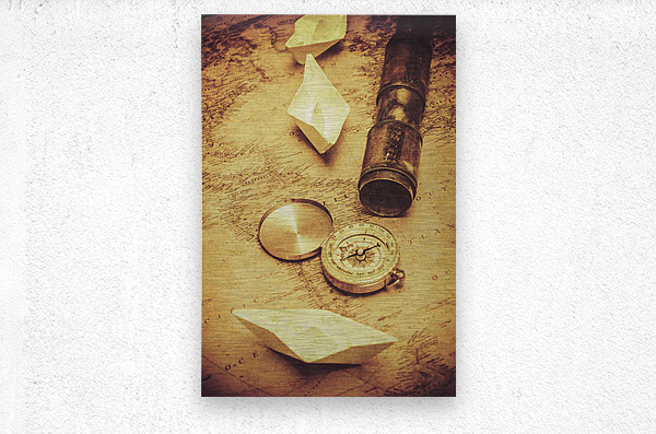 Global shipping artwork on a retro world trade route mapped out on a vintage paper globe with compass monocular and paper cargo boats