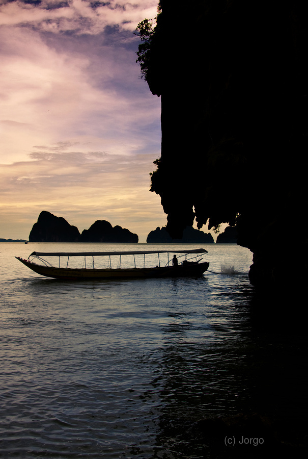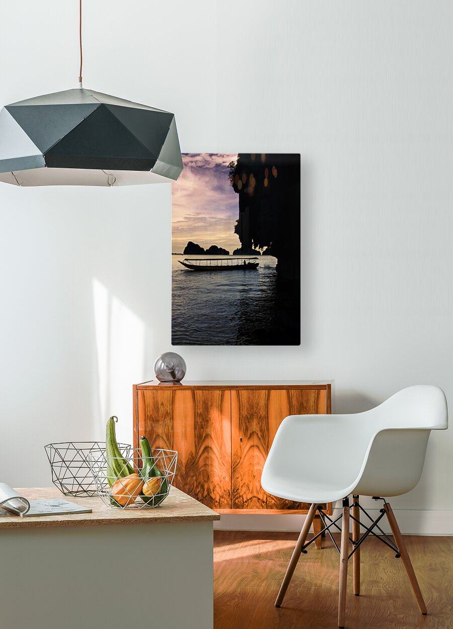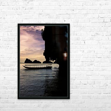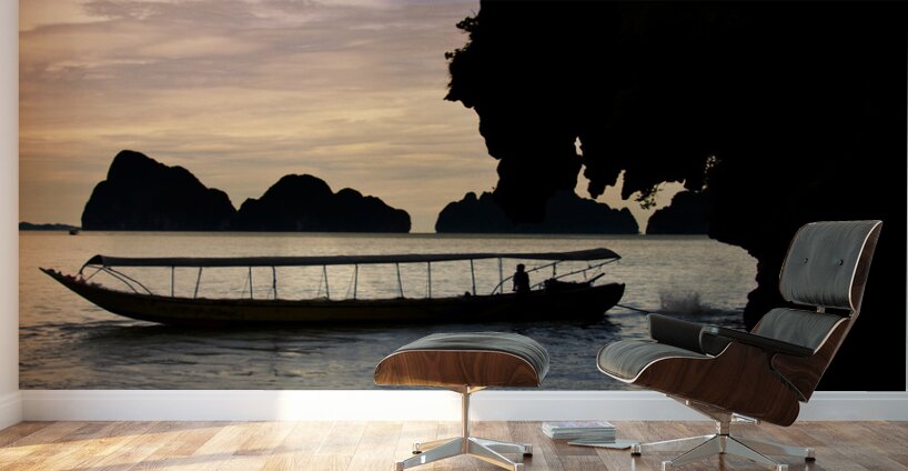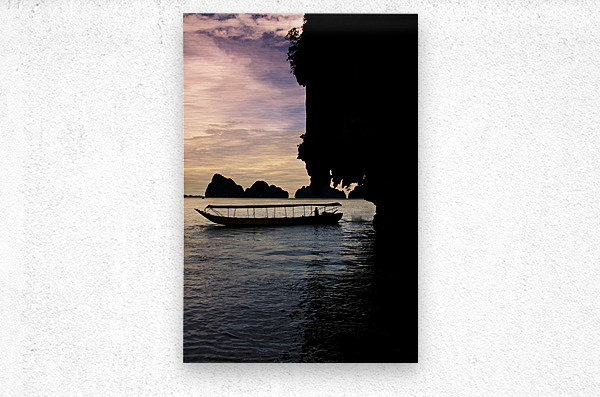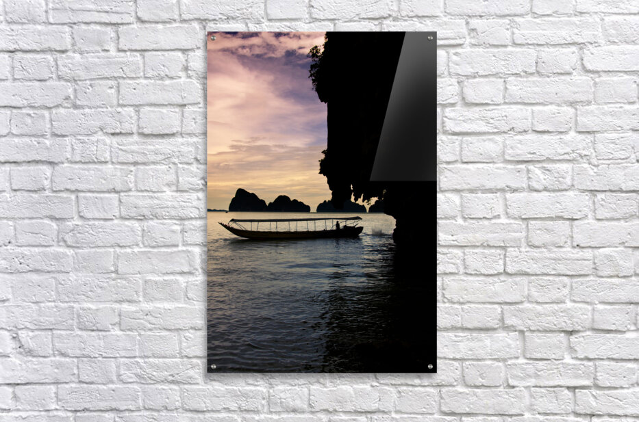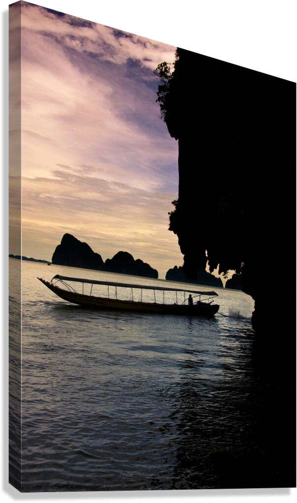 Harmonious And Serene Vertical Landscape Of A Long Boat Silhouette Driving On The Waters Beside The James Bond Island Shoreline During A Thailand Asia...[+]