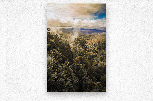 Nature landscape on an expansive countryside with remote hills and morning mist. Waratah lookout to Huon Valley Tasmania Australia