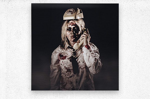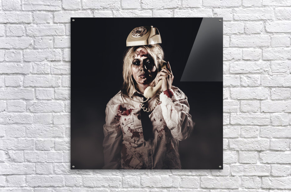 Funny customer service depiction of unhelpful telemarketing with a center clerk looking like death making a unfriendly telesales call with phone on head