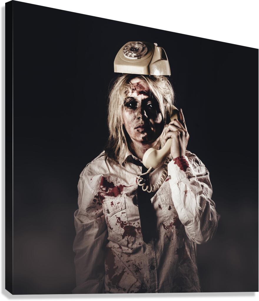 Funny customer service depiction of unhelpful telemarketing with a center clerk looking like death making a unfriendly telesales call with phone on he...[+]