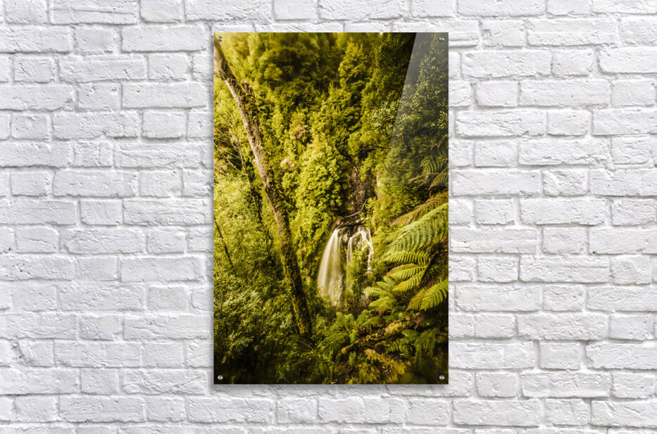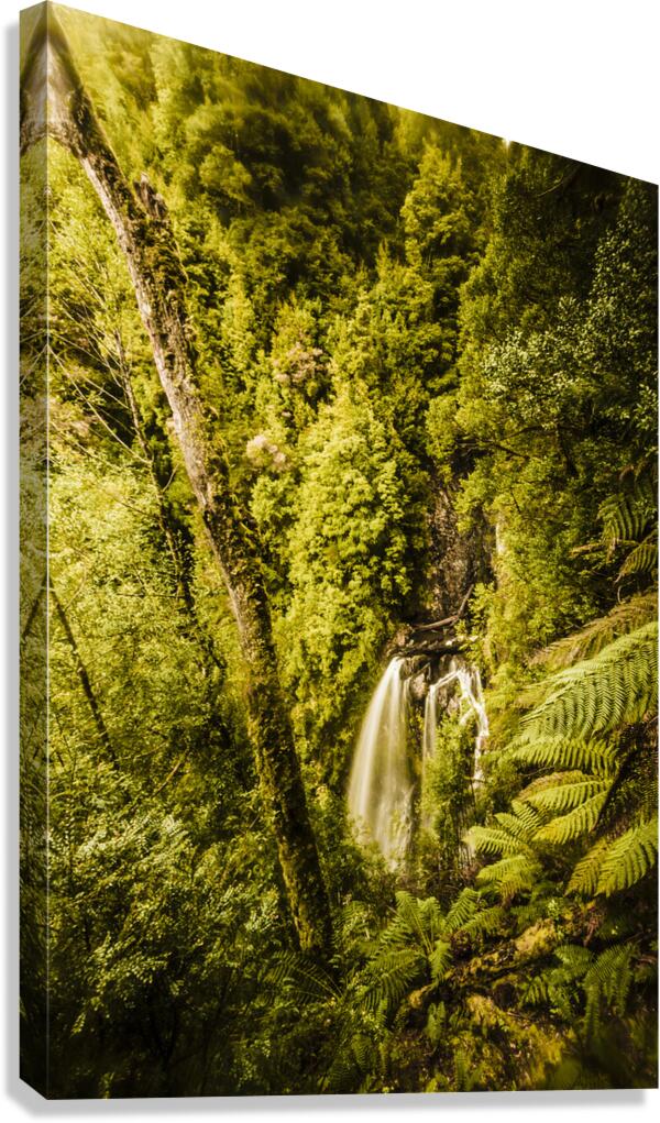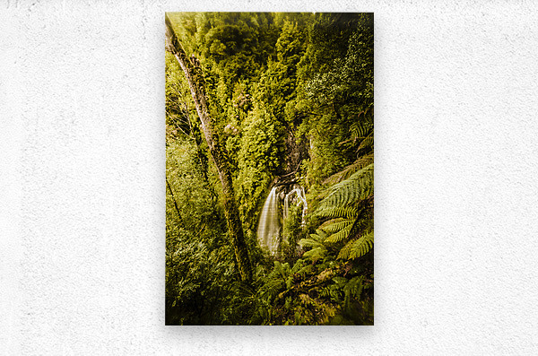 Green rainforest landscape on a cliff fall from a scenic elevation point. Philosopher Falls West Tasmania Australia