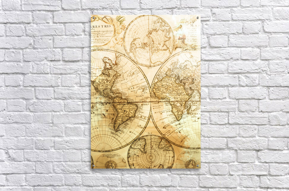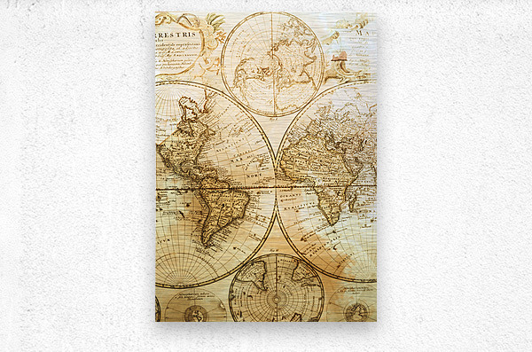 Vintage paper map of the world with aged stained and old 1800 names and locations. World of old