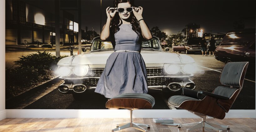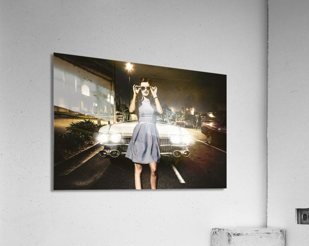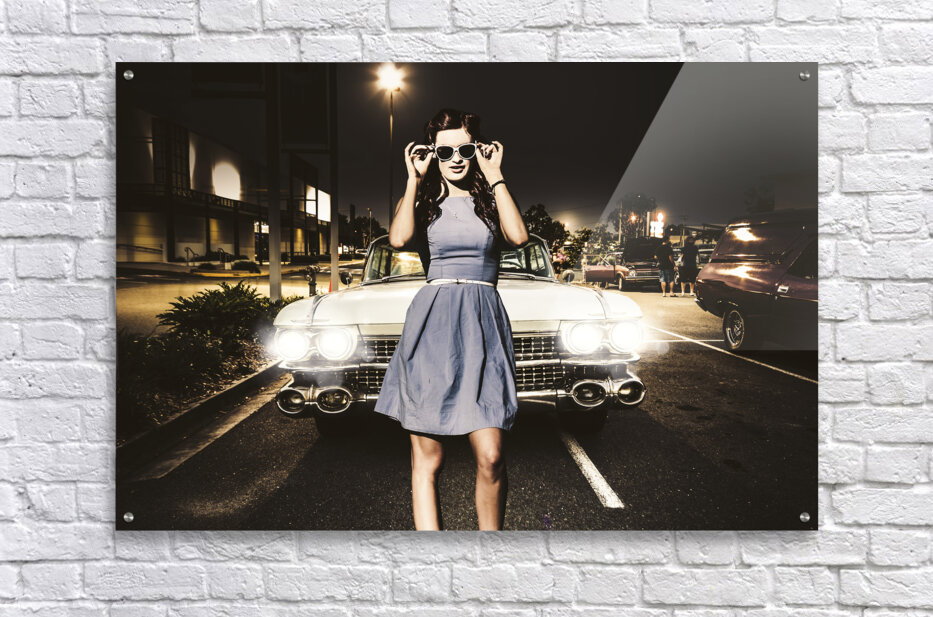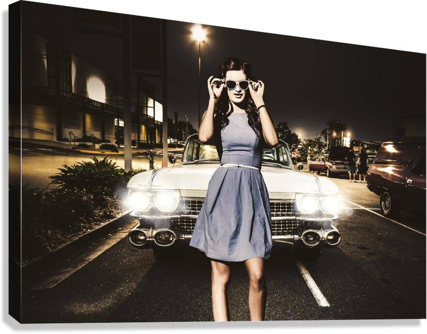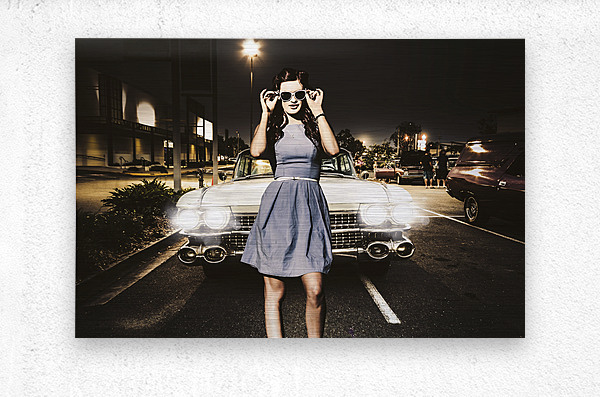 Awesome rockabilly greaser girl fashioning a signal to race in a retro carpark with her sixties Cadillac parked in two bays. 60s American car culture